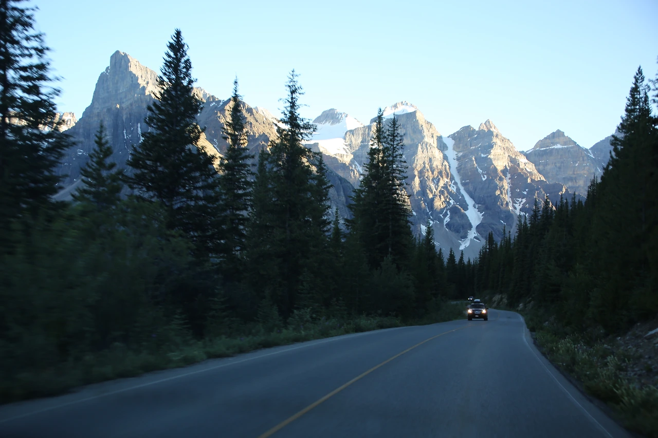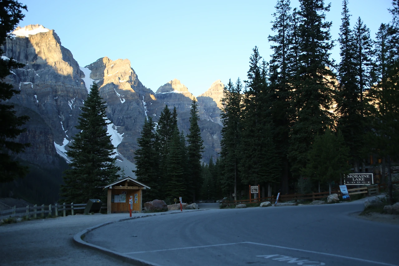 '나는 아직 레이크 루이스를 안 본 거야.'라는 최면을 걸고 모레인 호수로 향했습니다. 약 13km의 멀지 않은 거리지만 꼬불꼬불 산길이라 생각보다 시간이 걸렸어요. 모레인 쪽에서 나오는 자동차의 전조등이 꼬리에 꼬리를 물고 이어집니다. 반대로 호수 쪽으로 들어가는 차는 거의 없었어요. 그 길이 끝나는 곳에 모레인 호수가 있었습니다. 도무지 호수가 있을 것 같지 않은 산길을 돌고 도는 동안 텐 픽스(ten peaks)라 불리는 뾰족뾰족한 봉우리들이 나타나지요. 텐 픽스라 불리는 봉우리는 모두 3,000m가 넘습니다. 레이크 루이스가 해발 1,700m이니 모레인은 2,000m는 되지 않을까 짐작하며 찾아보니 1,885m네요.