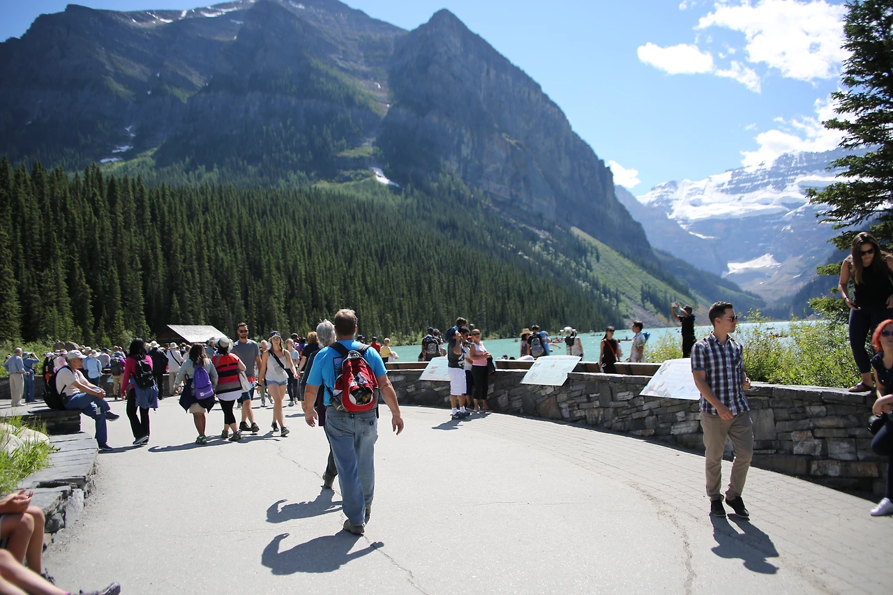 그곳에서 늦은 점심을 먹고 숙소인 디어 로지로 갔지요. 체크 인 시각까지는 한 시간이 남아있습니다. 리셉션의 아가씨는 날씨가 맑아서 아름다운 물빛을 볼 수 있을 테니 레이크 루이스에 다녀올 것을 권합니다. 숙소를 예약할 때 가장 매력적으로 생각된 것이 레이크 루이스까지 걸어서 5분 거리라는 것이었어요. 햇빛이 따끈따끈합니다. 페어몬트 샤또 레이크 루이스 호텔이 보이기 시작했습니다. 너무 밝아서인지 호텔 외관이 사진에서 봐왔던 것보다 아름답지 않았어요. 주차장에 자동차가 빼곡한 걸 보니 사람이 많은가 봅니다.