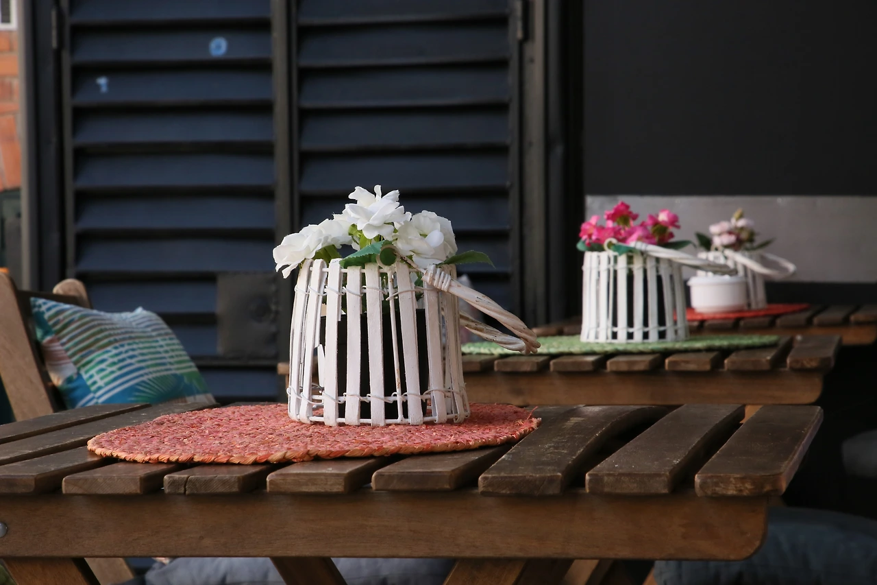 야외테이블에 앙증맞은 바이올렛이 따사로운 햇빛 속에 파스텔컬러를 뽐내고 있어요.