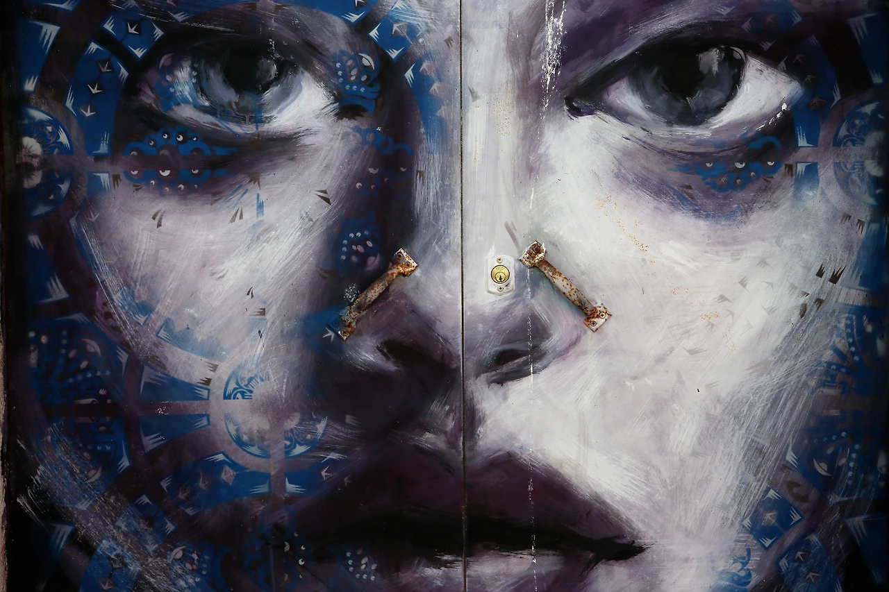 벽화는 어디서든 볼 수 있지만 문에 사람 얼굴을 그려 놓은 건 좀 생소하지요.
