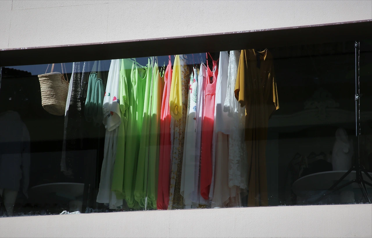 쇼윈도에 걸린 옷들이 1월을 무색하게 하는 비비드 컬러들이에요.