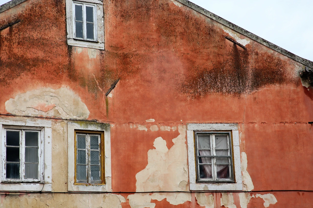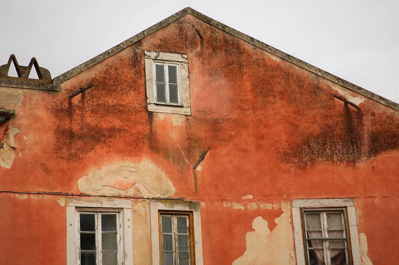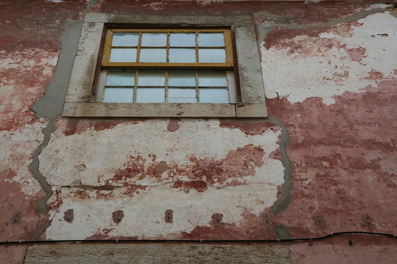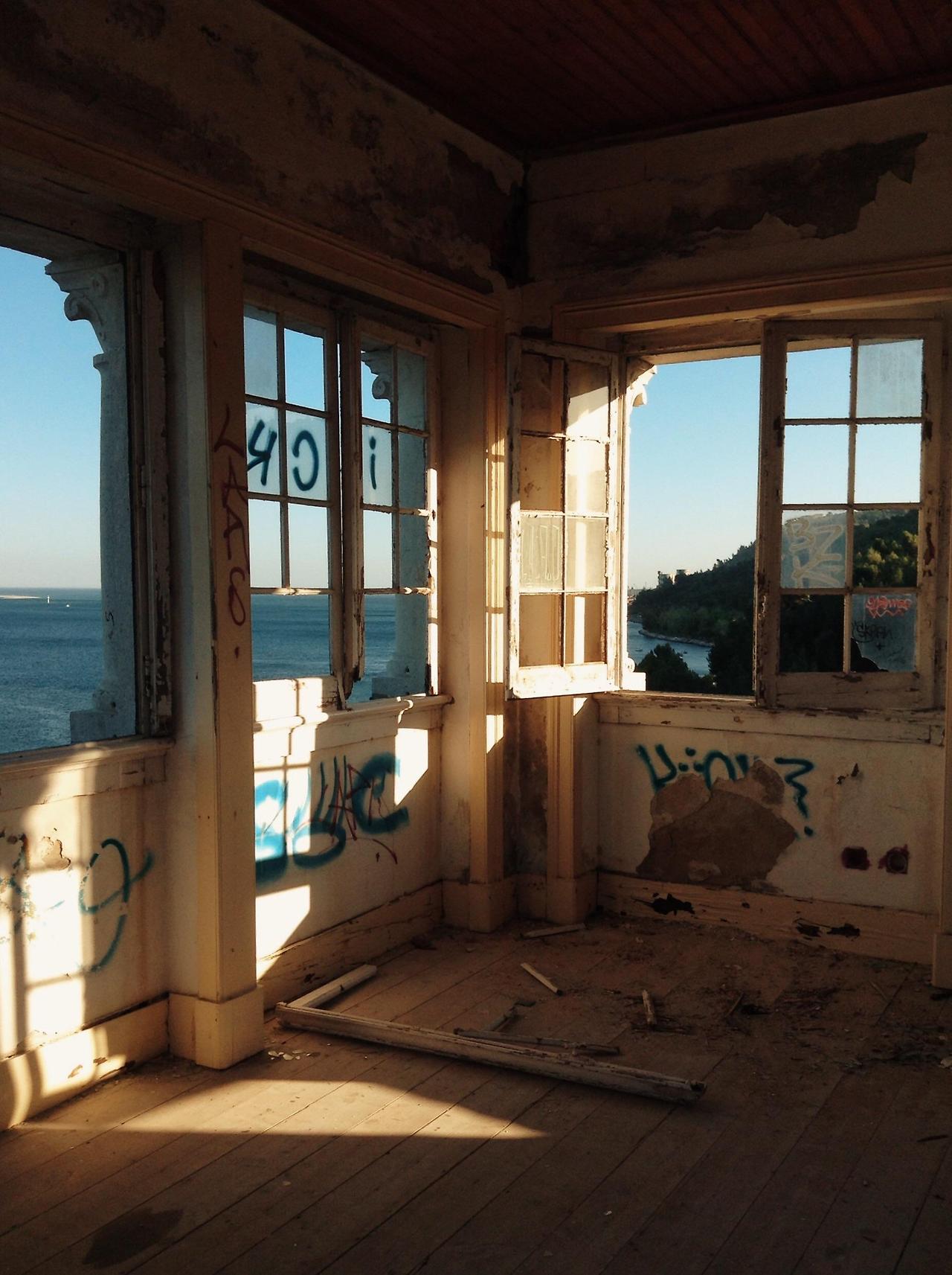 소금기 머금은 바닷바람에 삭아버린 핑크빛 페인트칠을 한 벽에 세 개의 창이 있습니다.