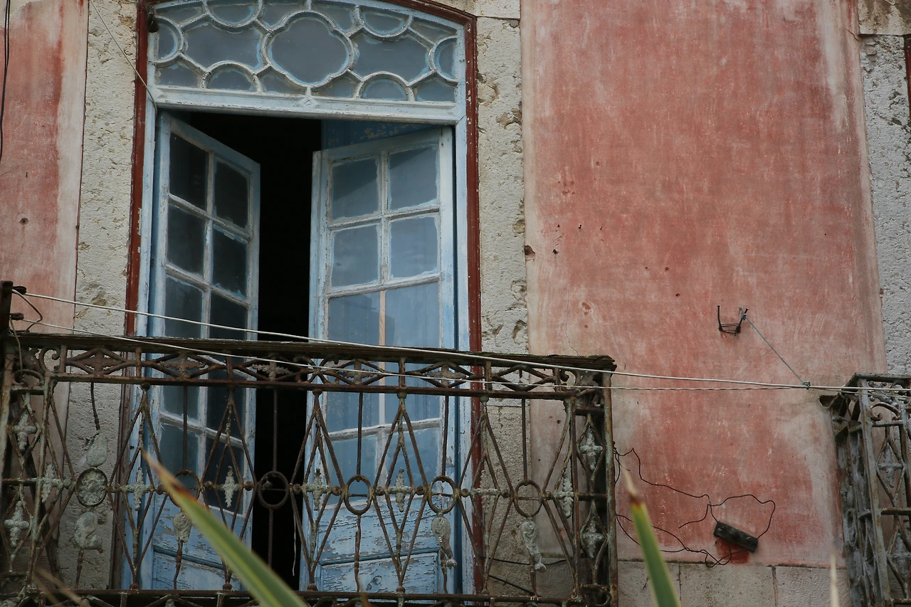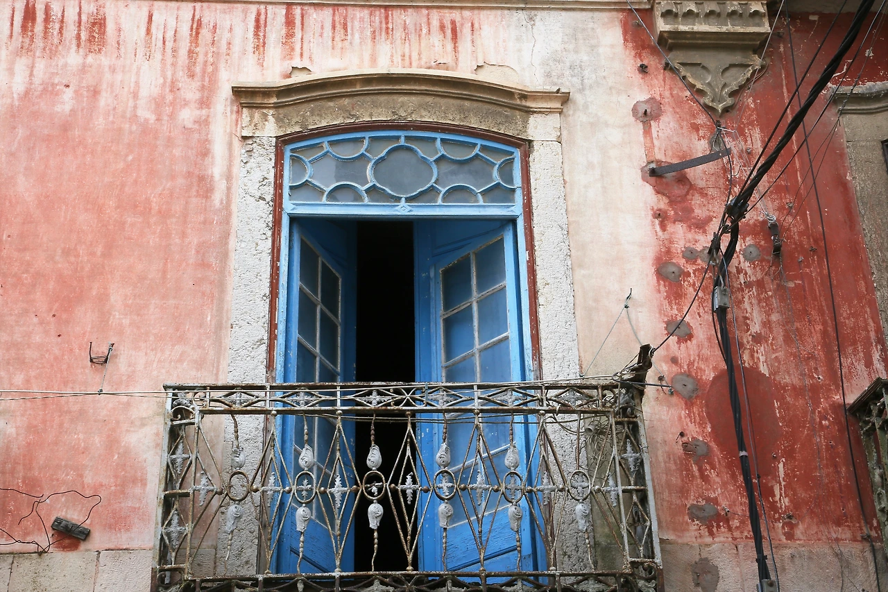 핑크색 벽면에 노랑과 파랑 문틀이 무너져가고 있어도 아름답습니다.