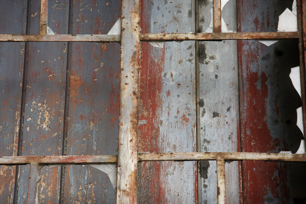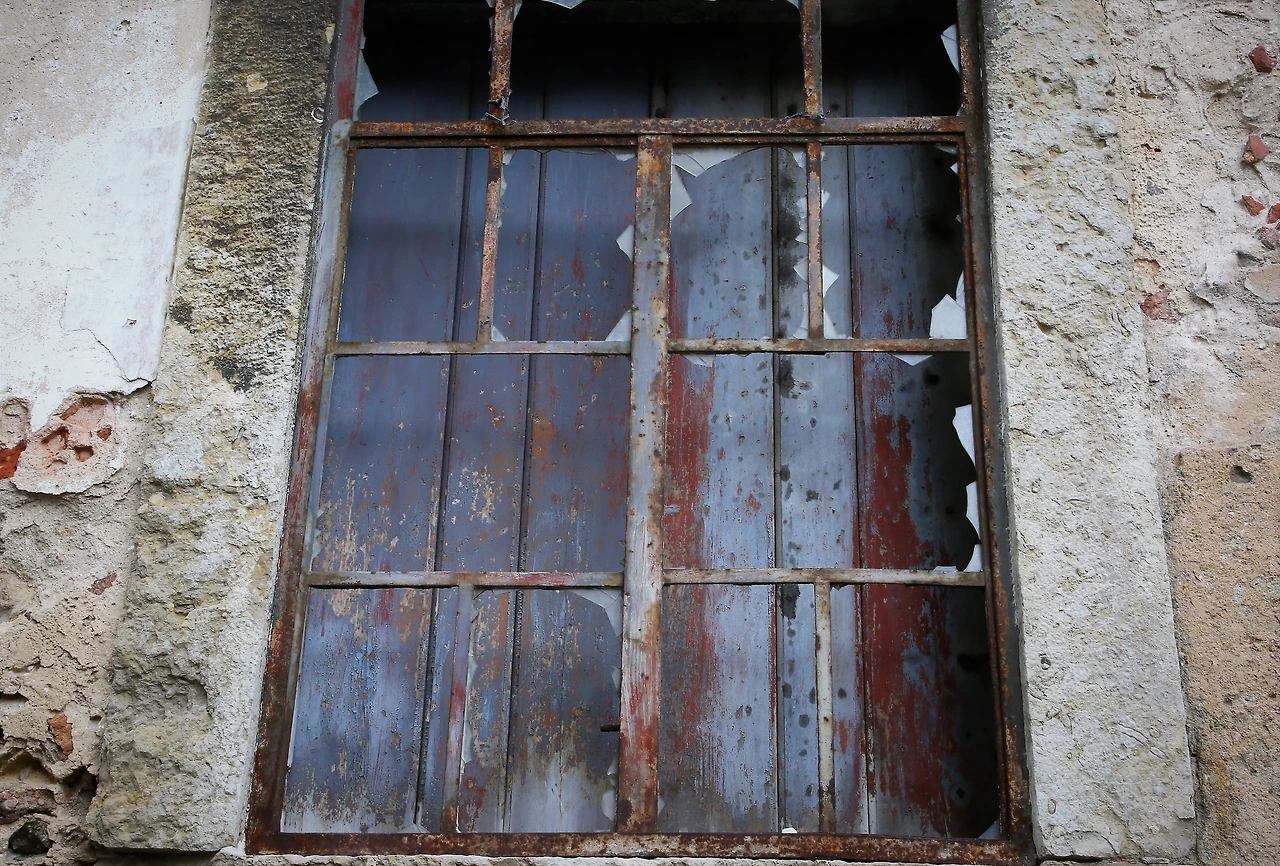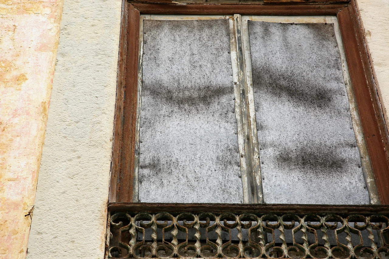 깨진 유리창의 안쪽에 나무판자를 덧대놓은 창이 많습니다.