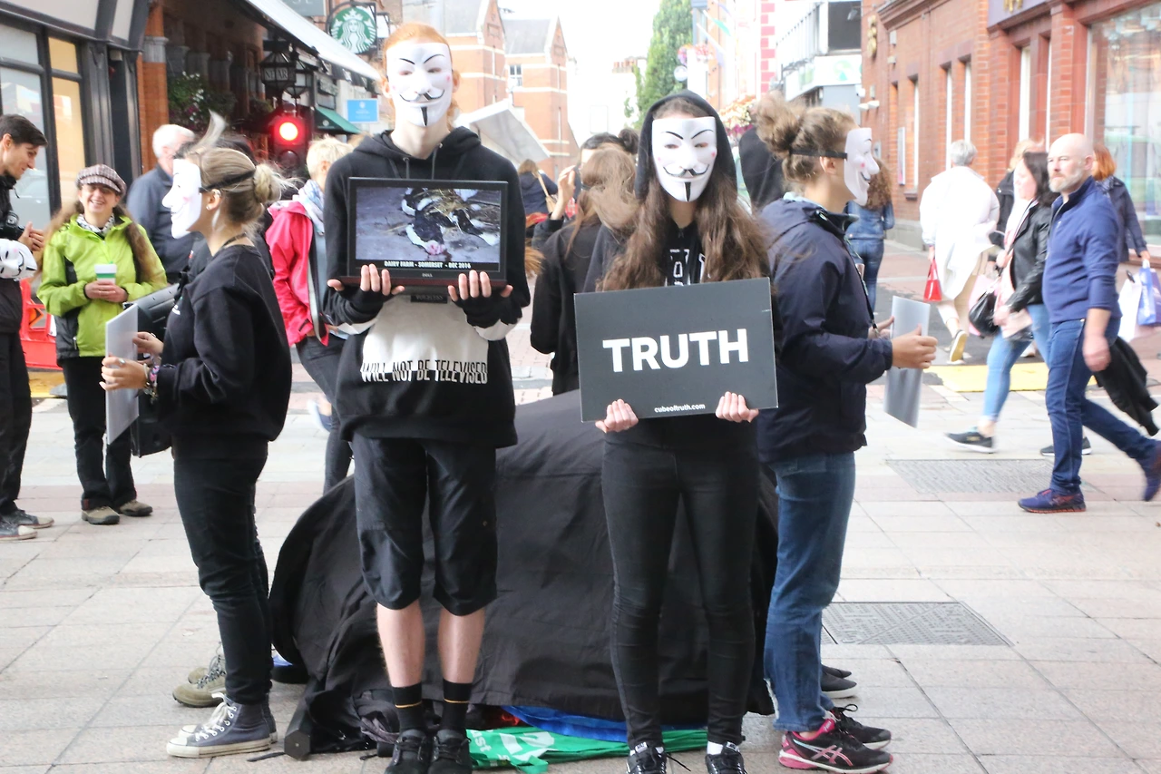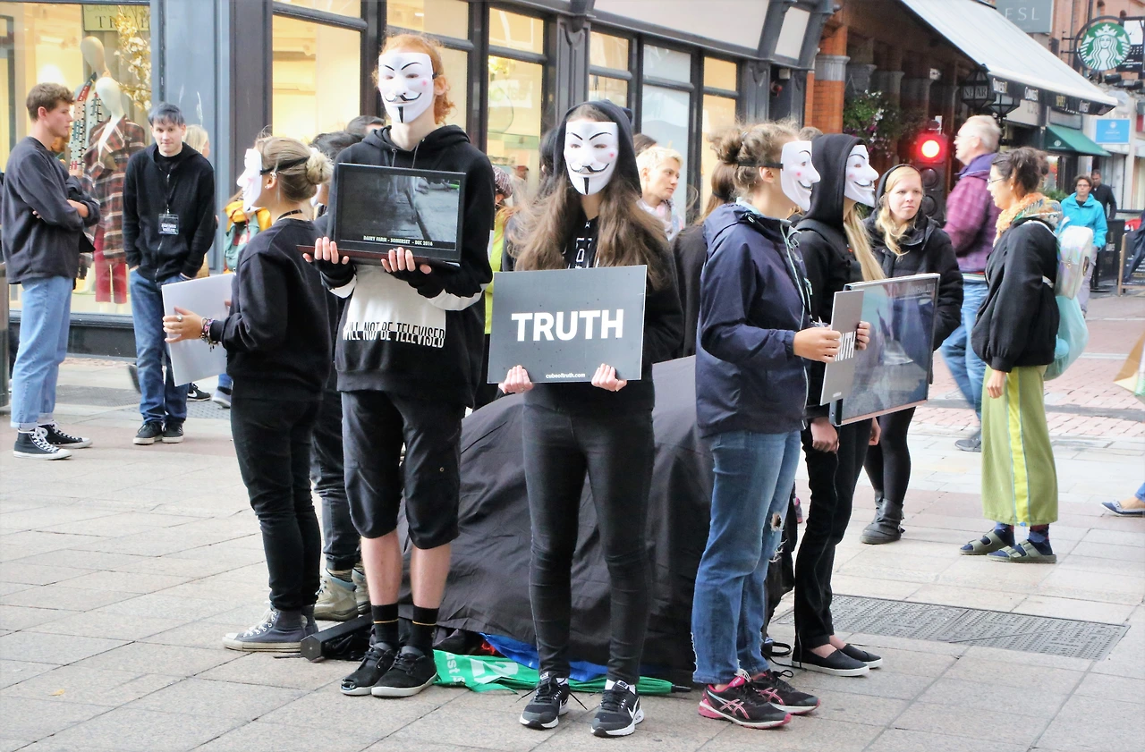 영화 브이 포 벤데타에서 보았던 똑같은 마스크를 쓴 사람들이 뭔가를 들고 침묵시위를 하고 있다.