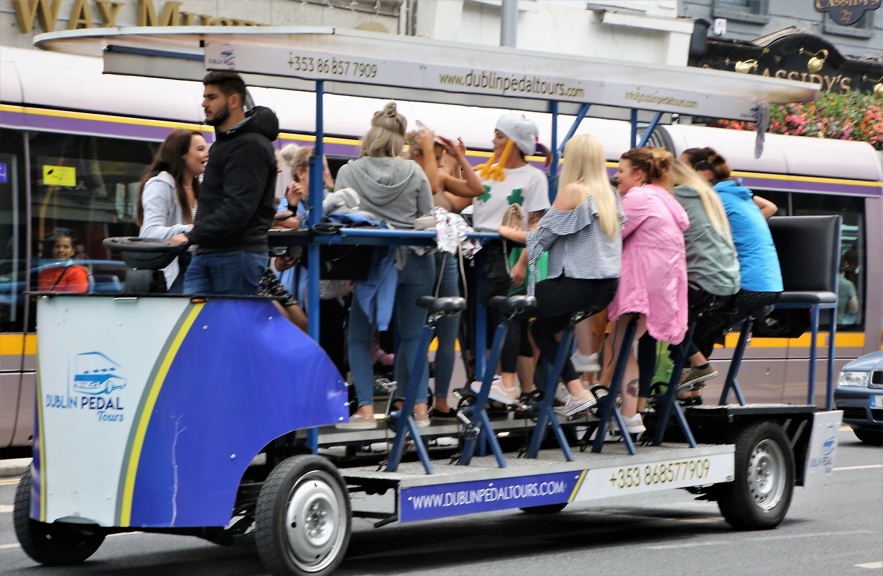 맨 앞사람이 핸들로 방향을 잡고 열 명 정도의 사람들이 페달을 밟아서 움직이는 방식이다.