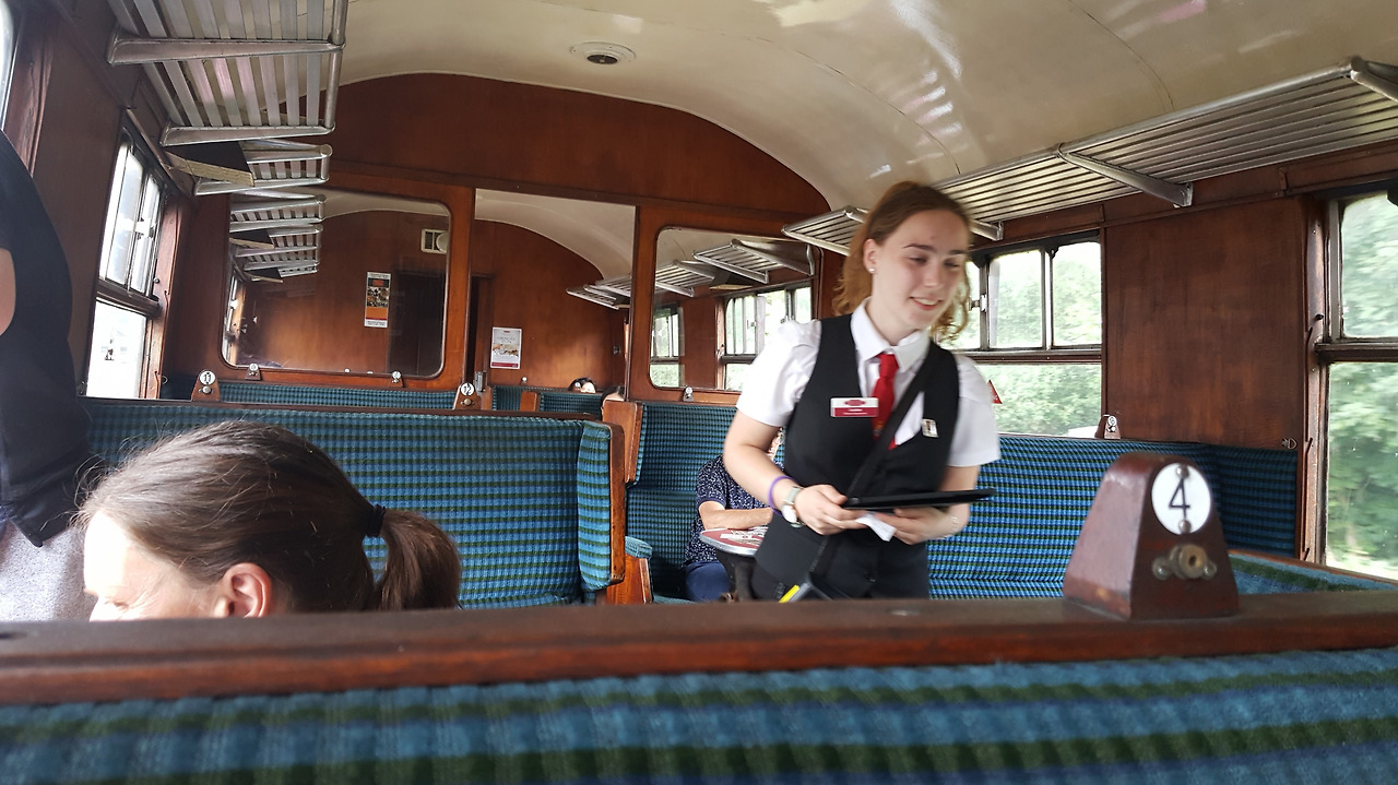 기차의 나무 프레임은 오랜 세월 동안 손때가 묻어 반질반질합니다.