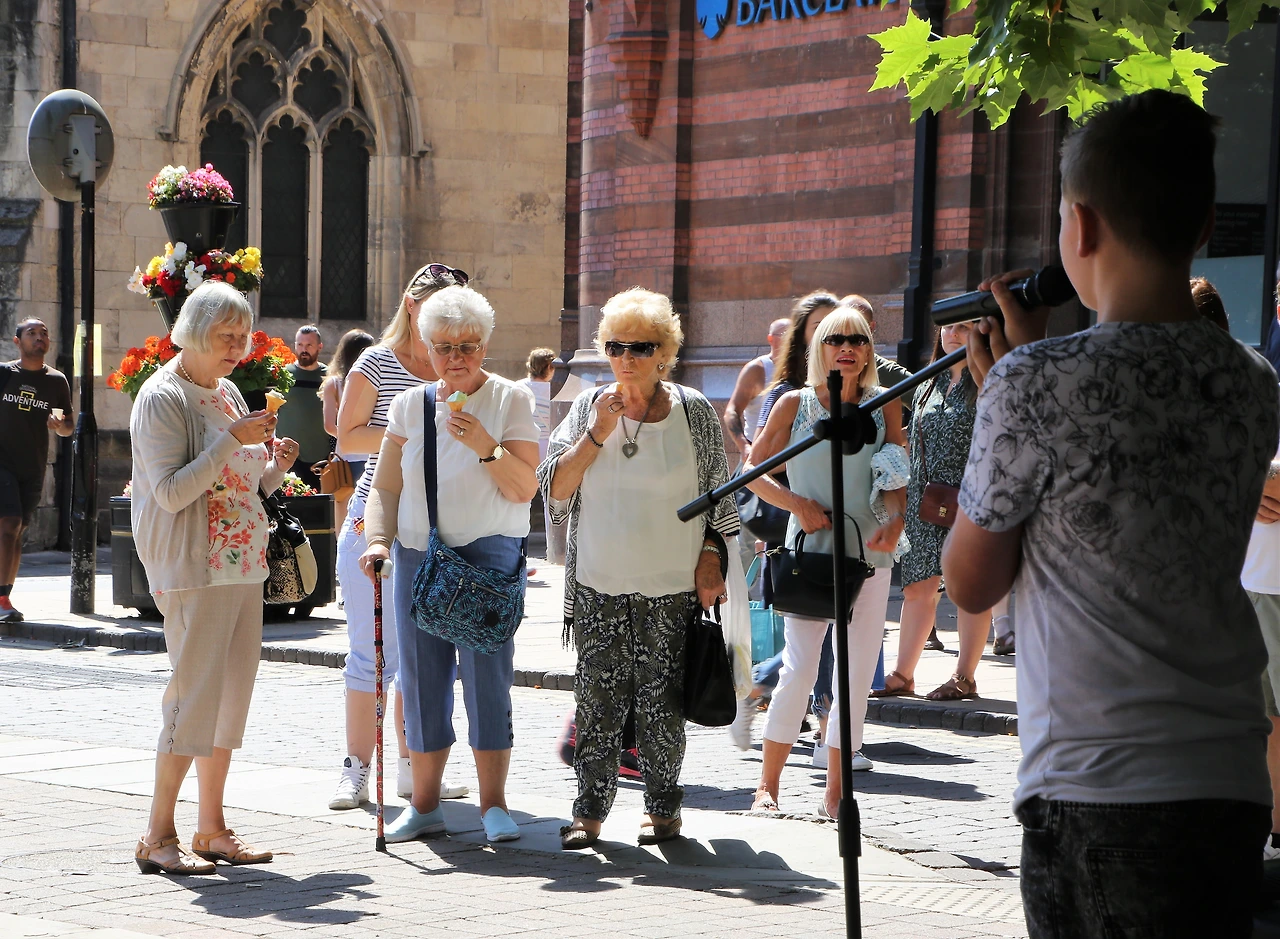 은발의 할머니들이 소녀처럼 아이스크림을 먹으며 소년의 노래를 듣습니다.