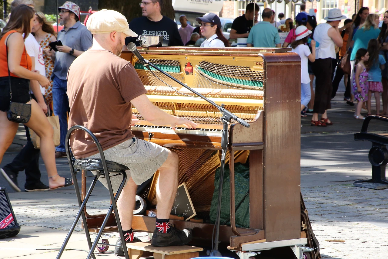 피아노의 페달을 밟는 피아니스트의 양말에 유니언 잭이 그려져 있습니다.