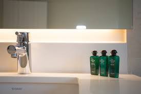 화이트 컬러의 욕조와 수전은 독일 명품 듀라빗(Duravit)의 제품이고 세면대 거울 앞에는 초록색 에르메스 어메니티가 줄 지어 서있습니다.