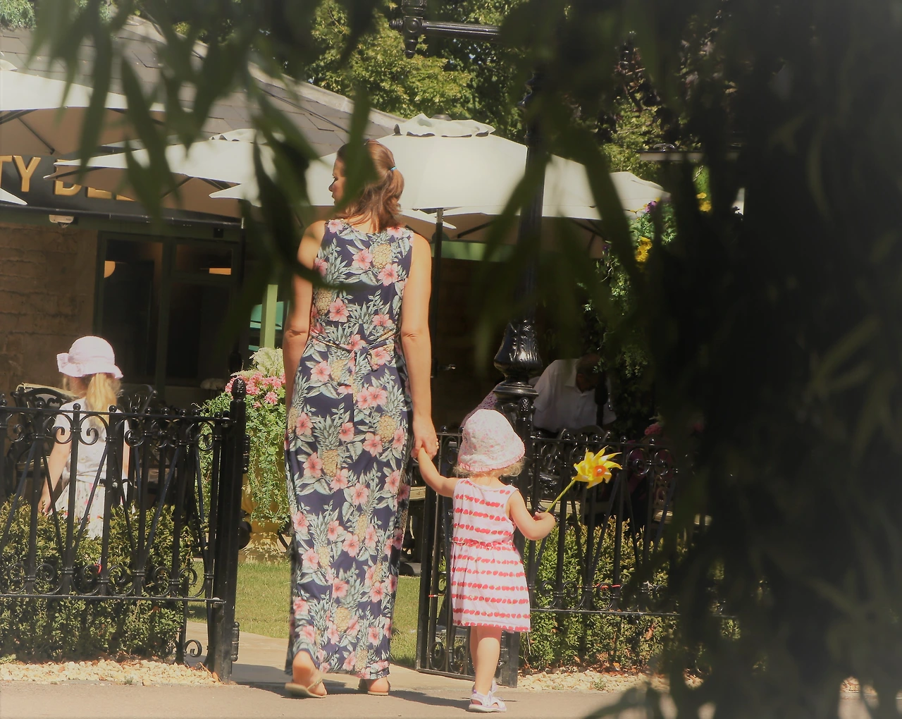 할아버지의 손을 잡은 작은 아이가 핑크 색 원피스를 입고 다리를 건너갑니다.