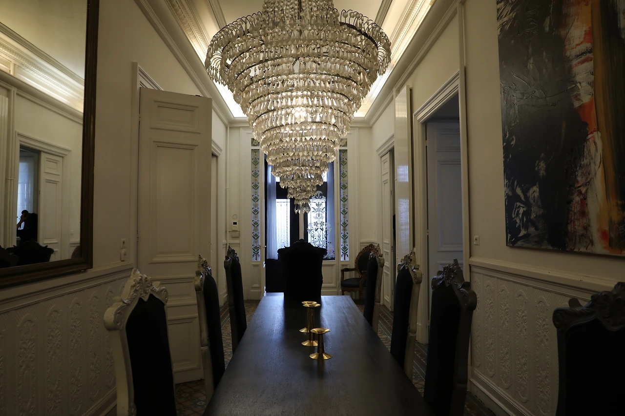 샹들리에가 걸린 10인용 식탁과 마치 수도원을 연상시키는 등받이가 1m는 될법한 의자 ,