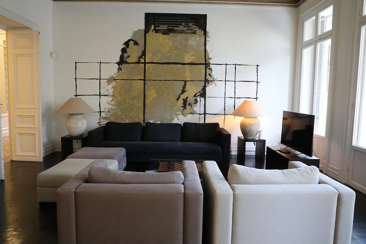 리빙룸에 걸린 모노톤의 대형 추상화는 세련된 그레이 컬러의 카우치와의 매치가 찰떡이다.