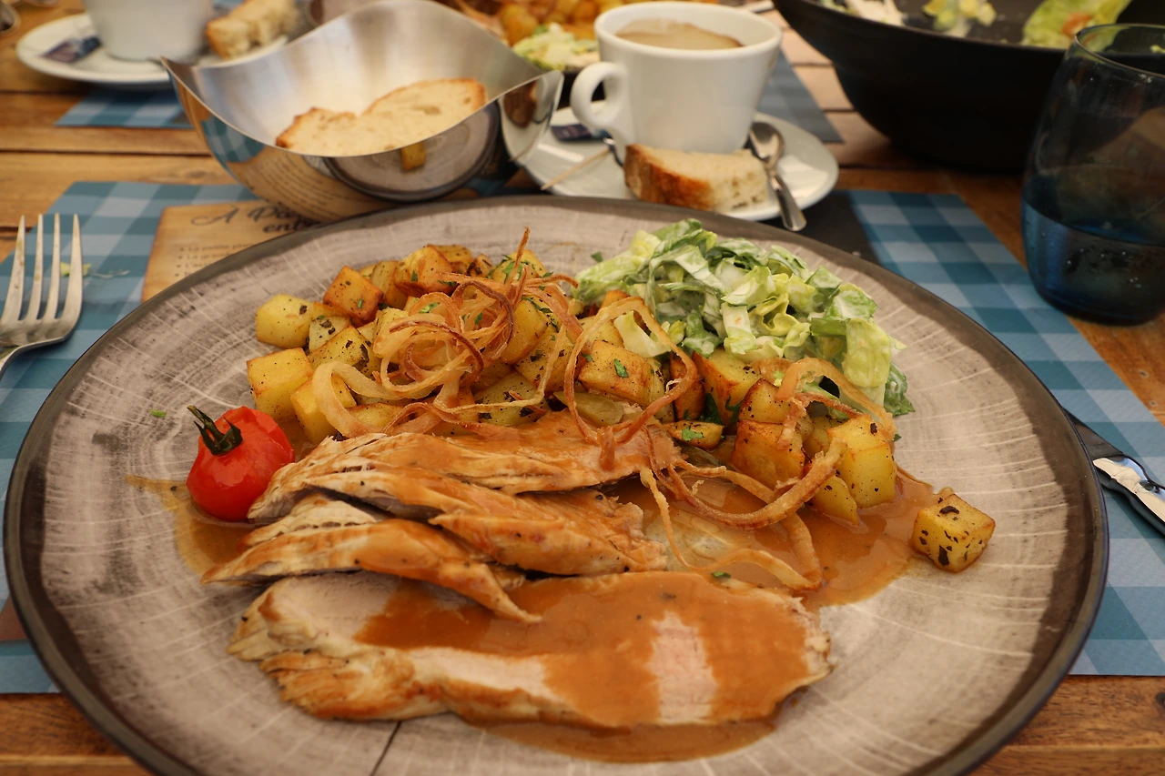 슈니첼을 주문했는데 고기의 어마어마한 사이즈에 놀라고, 고기의 퍽퍽함에 두 번째 놀라고, 디저트로 나온 초코 무스의 양에 또 한 번 놀랐다.