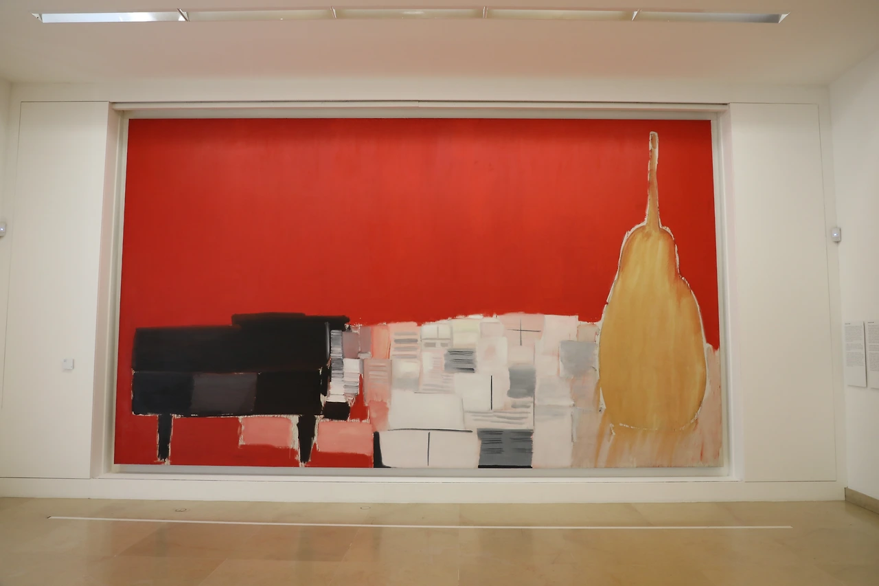 전시실의 한쪽 벽면을 가득 메운 빨간색 배경에 노란색 콘트라베이스와 검정 피아노앞쪽으로 악보가 쏟아져내린 듯한 형상이다.