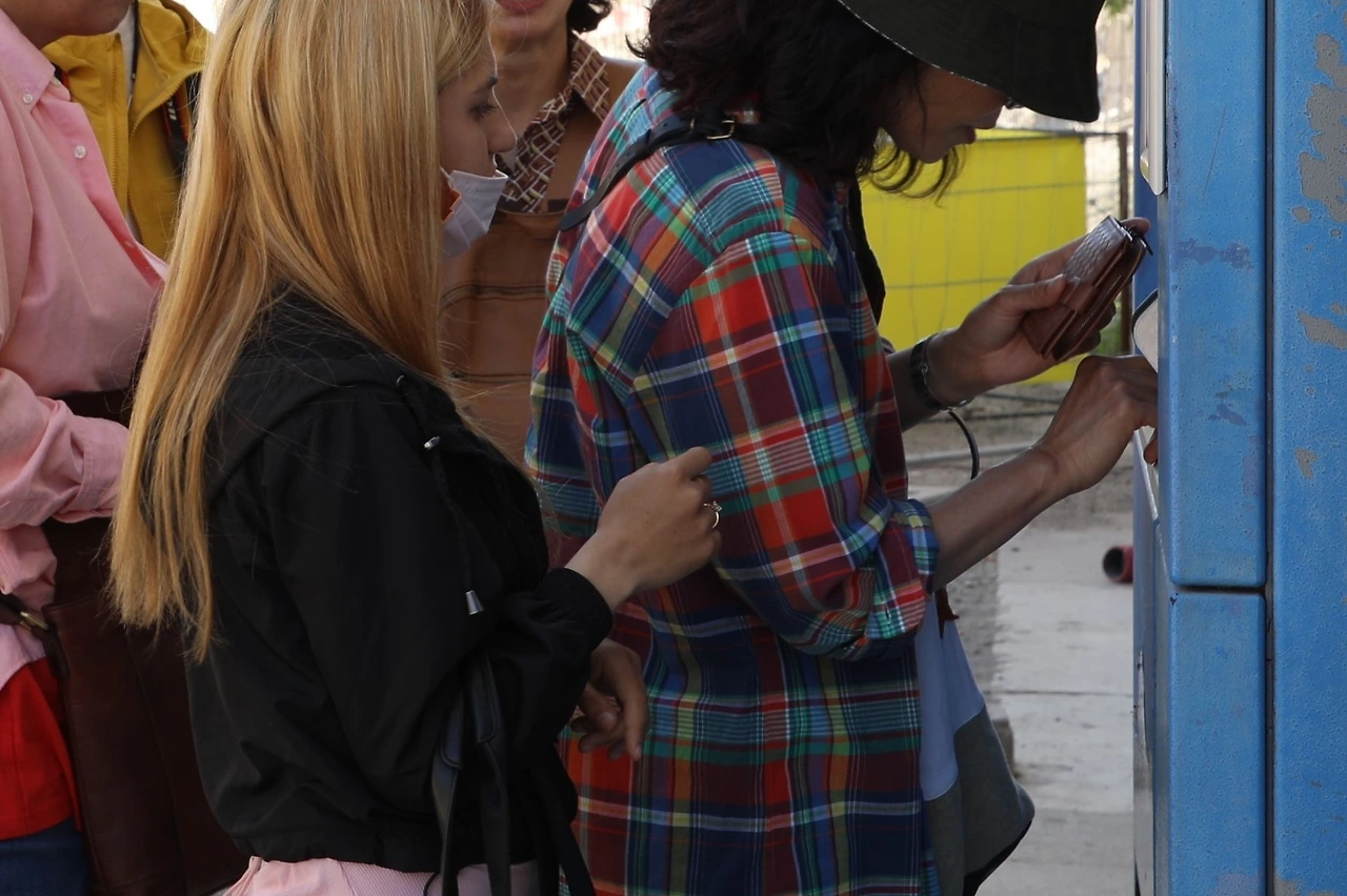 티켓팅 하는 LJ 옆의 마스크를 착용한 여자 아이