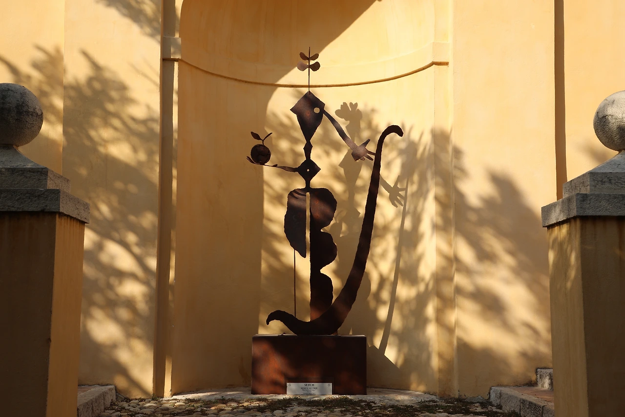 앙티브에 만들어진 작품을 앞에서 보면 남자가 무릎을 감싸 안고 있는데 뻥 뚫려있는 가슴이 하트 모양이다.