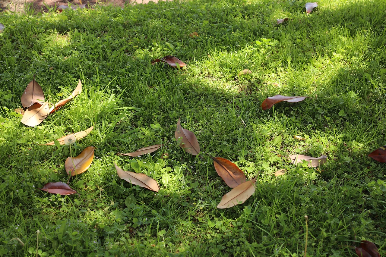 잔디밭엔 희거나 노란 자잘한 꽃들, 일찍 떨어진 낙엽들이 초록 잔디와 자연스럽게 조화를 이룬다.