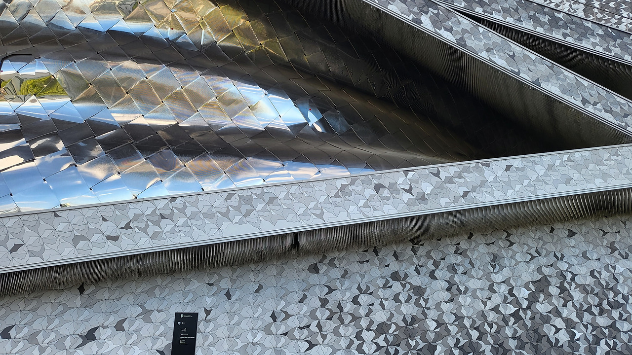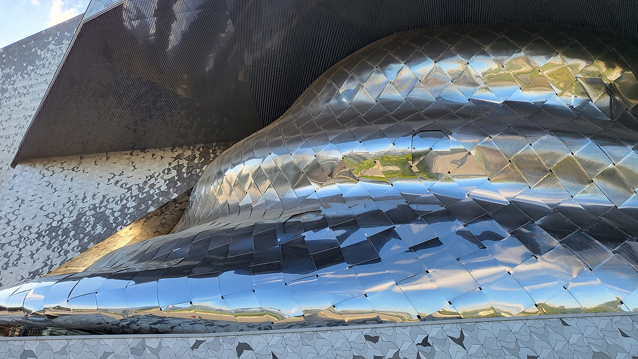 필하모니 드 파리는 비상하는 새의 모티브를 딴 25만여 개 은회색 알루미늄 타일이 건물 전체를 감싸고 있는 모습이거든요.