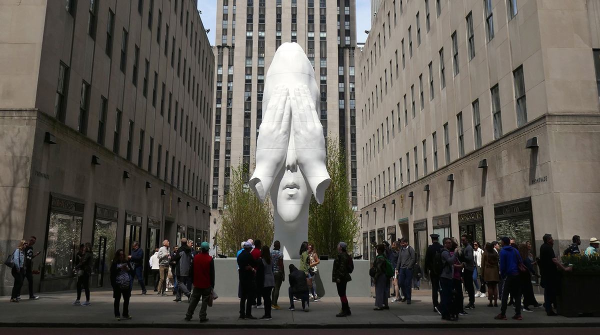 또한 그는 허드슨 강 수변에서 손가락을 입술에 대고 있는 한 여성의 거대한 머리 조각상을 공개했습니다.