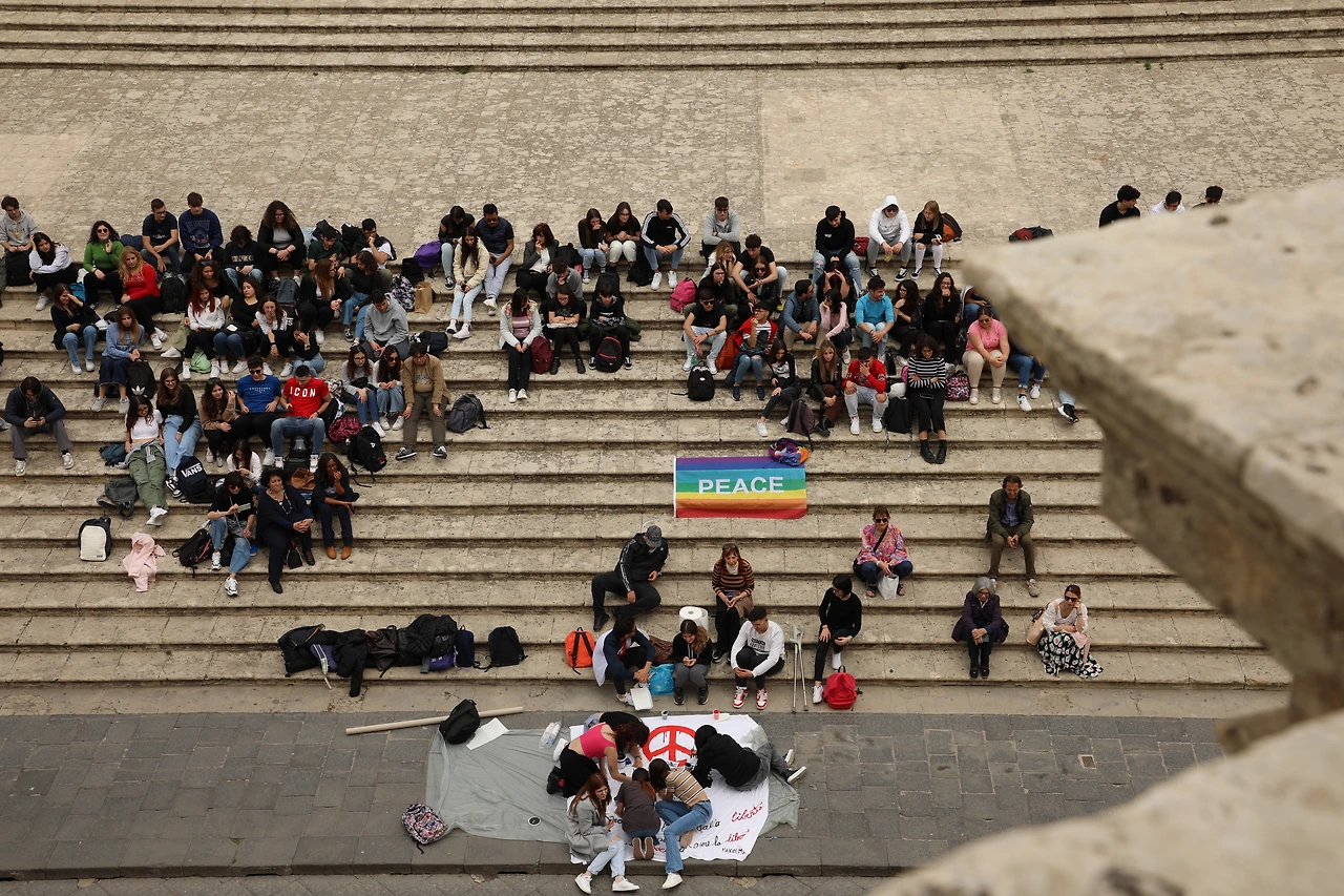 몇몇의 사람들이 하얀 깃발에 글씨와 그림을 그리는 모습도 보인다.