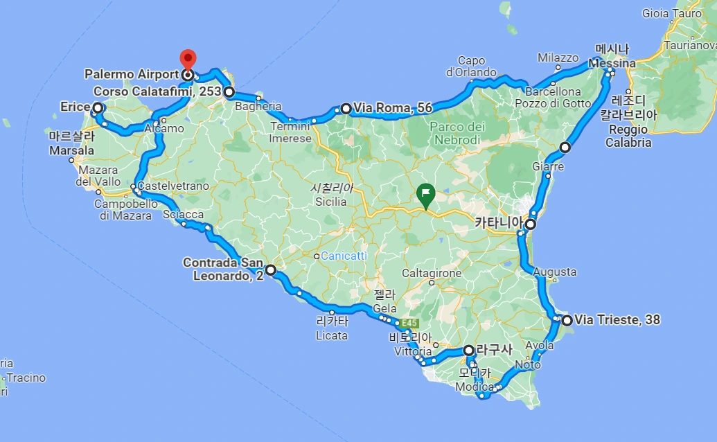 시칠리아의 이동 경로를 구글 지도로 그려보니 이런 모습이다.