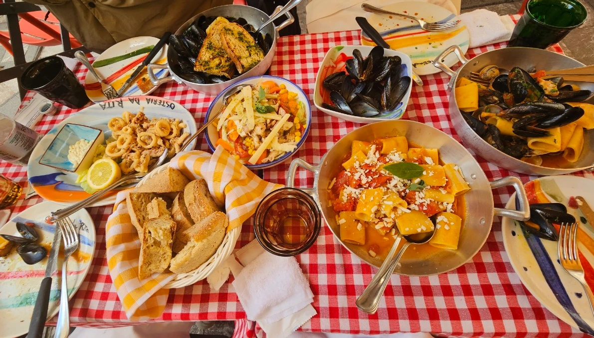샐러드와 홍합 스튜, 그리고 넓적한 팬네 파스타, 깔라마리까지 모든 음식이 만족스러웠다.