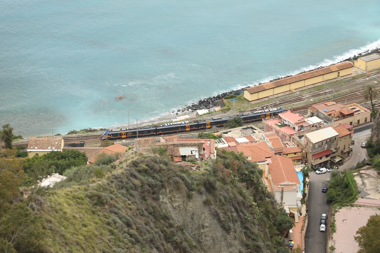 타오르미나 중심가에서 내려다보이는 바닷가 철길과 도로
