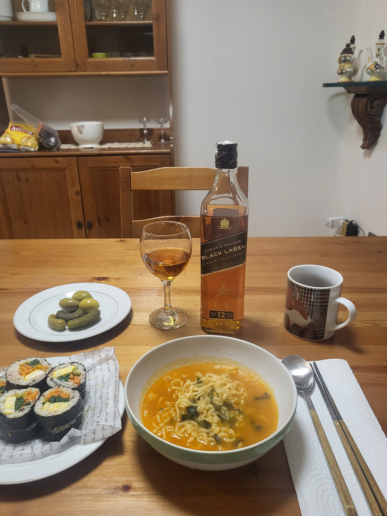 D가 아침에 싸준 김밥과 너구리 반 봉지를 끓였다.