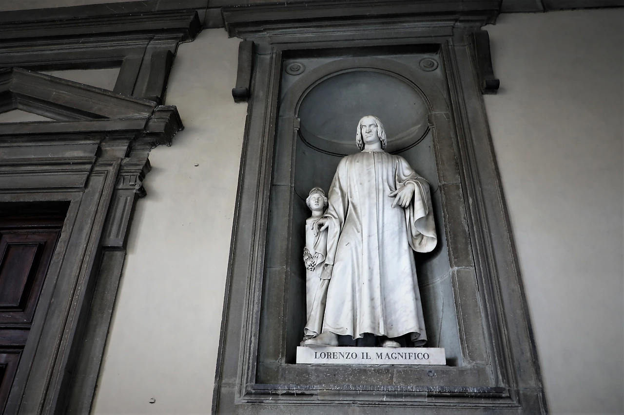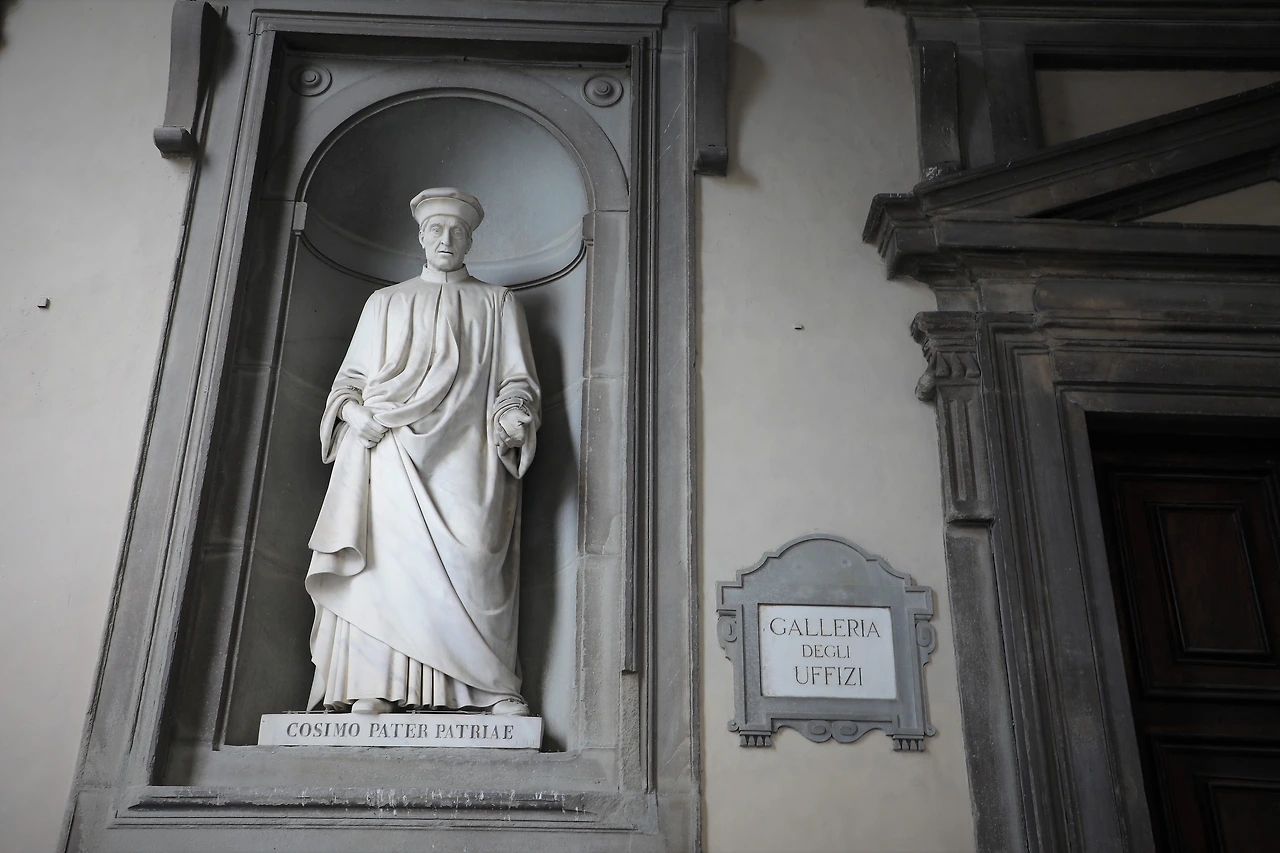 베키오 다리 우피치 미술관 벽에 남아있는 조각상, 조국의 아버지라 불린 코지모 메디치와 로렌초 일 마니피코