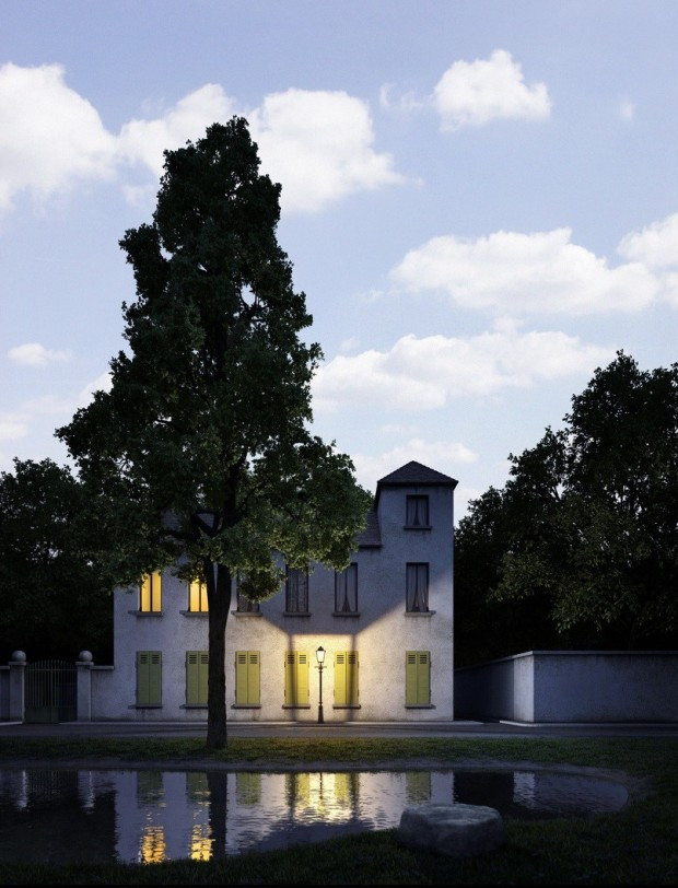 그런데 하늘은 하얀 구름이 떠있는 한낮이고, 주택이 있는 아래쪽은 가로등이 켜있는 저녁을 묘사하고 있다.
