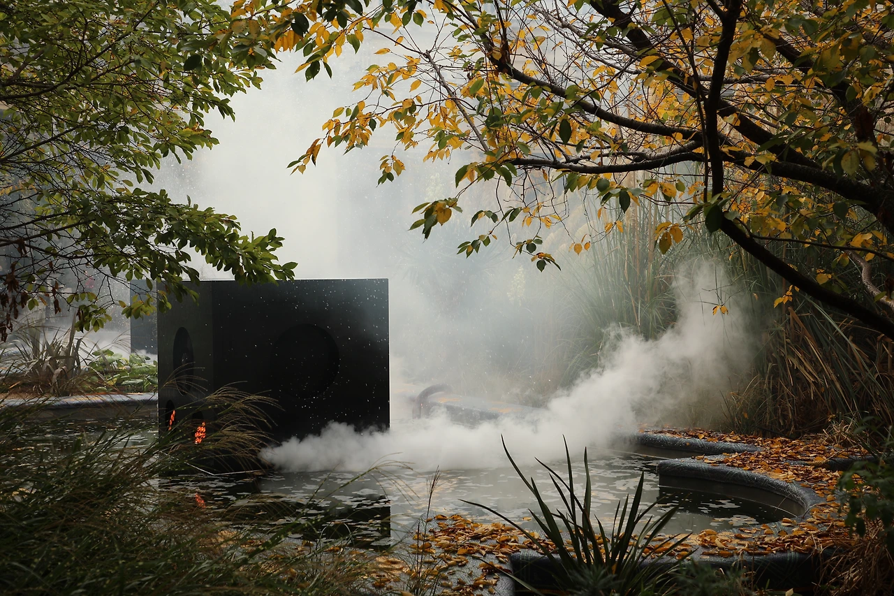 정원의 연못에 설치된 검은 오닉스 사이로 하얀 연기가 간헐적으로 뿜어 나오더군요.