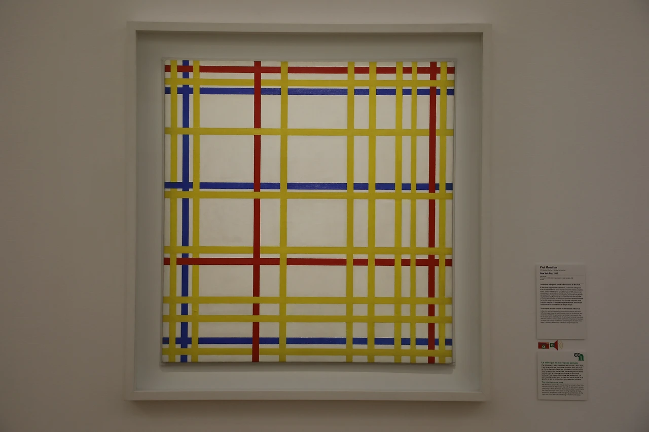 제목을 보니 빨간색, 노란색, 파란색의 직선은 1940년대 초 활기 넘치는 뉴욕의 빌딩을 블록으로 나타낸 것이었습니다.