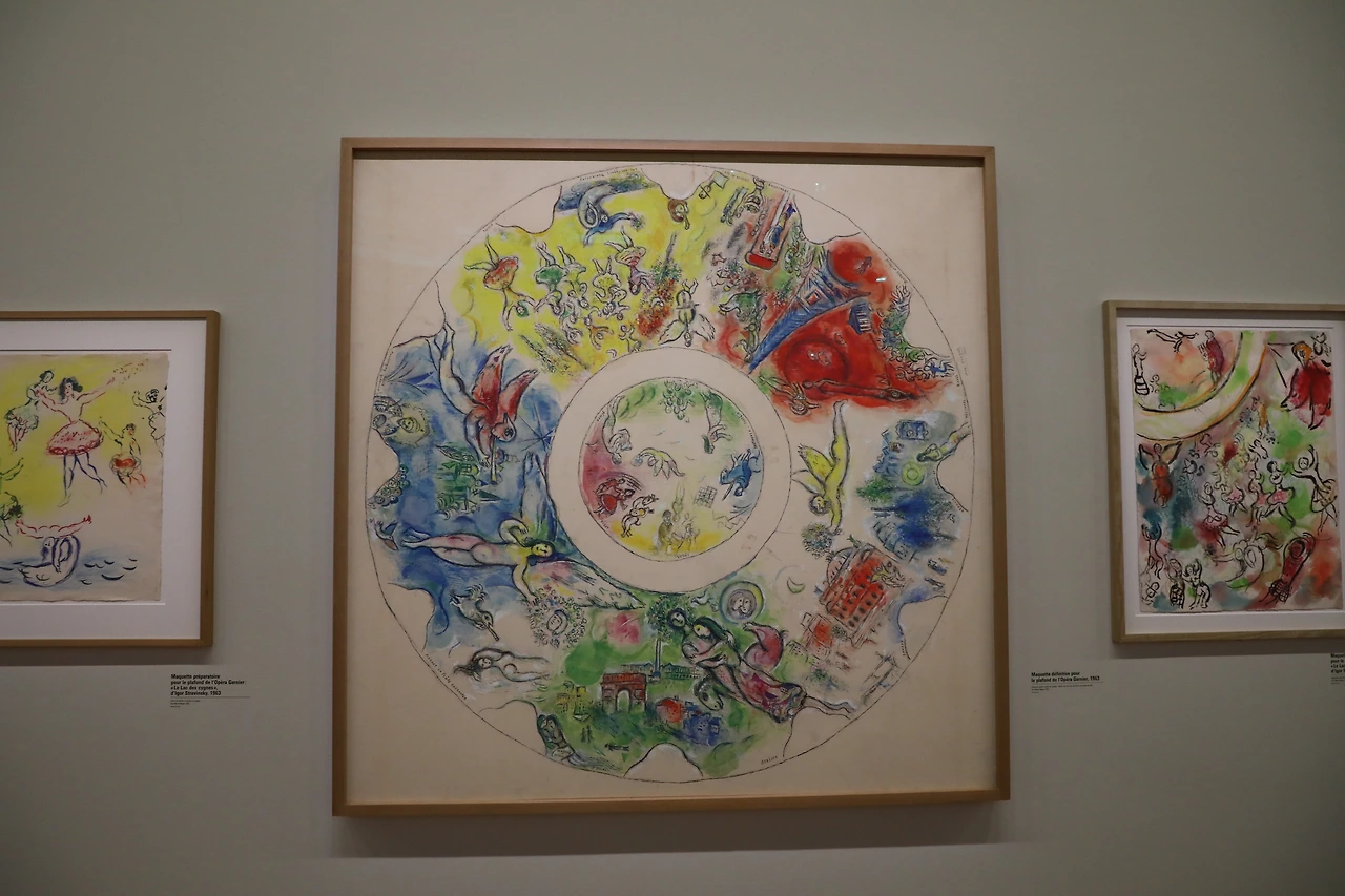오페라 가르니에 공연장 무대의 천장에서 보았던 프레스코화 '꿈의 꽃다발'을 작업하기 전의 스케치와 모형, 스트라빈스키의 '불새' 발레 의상과 커튼 준비 스케치와 그의 대표작이 여럿 전시되어 있습니다.