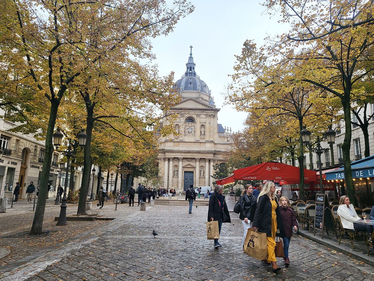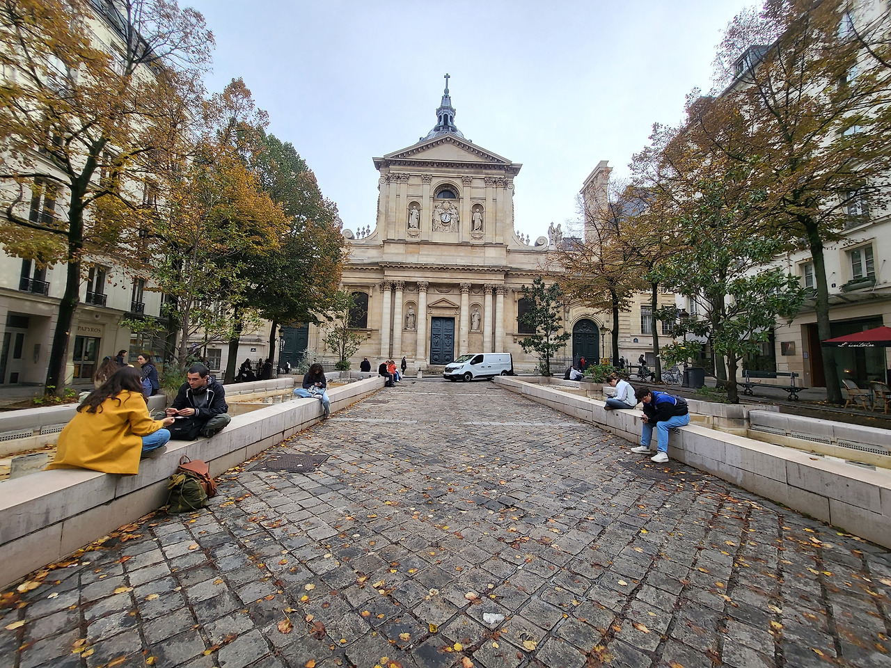 작은 도로 건너편에서 멀뚱멀뚱 그들을 바라보다가 부근의 소르본 광장 벤치로 자리를 옮겼습니다.