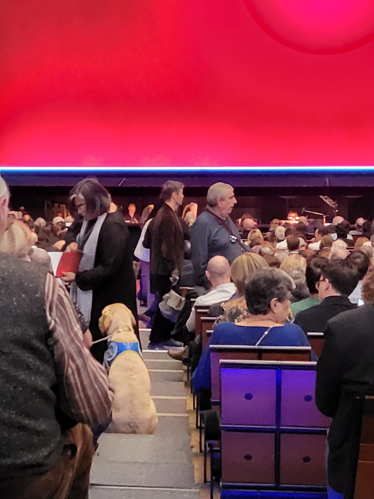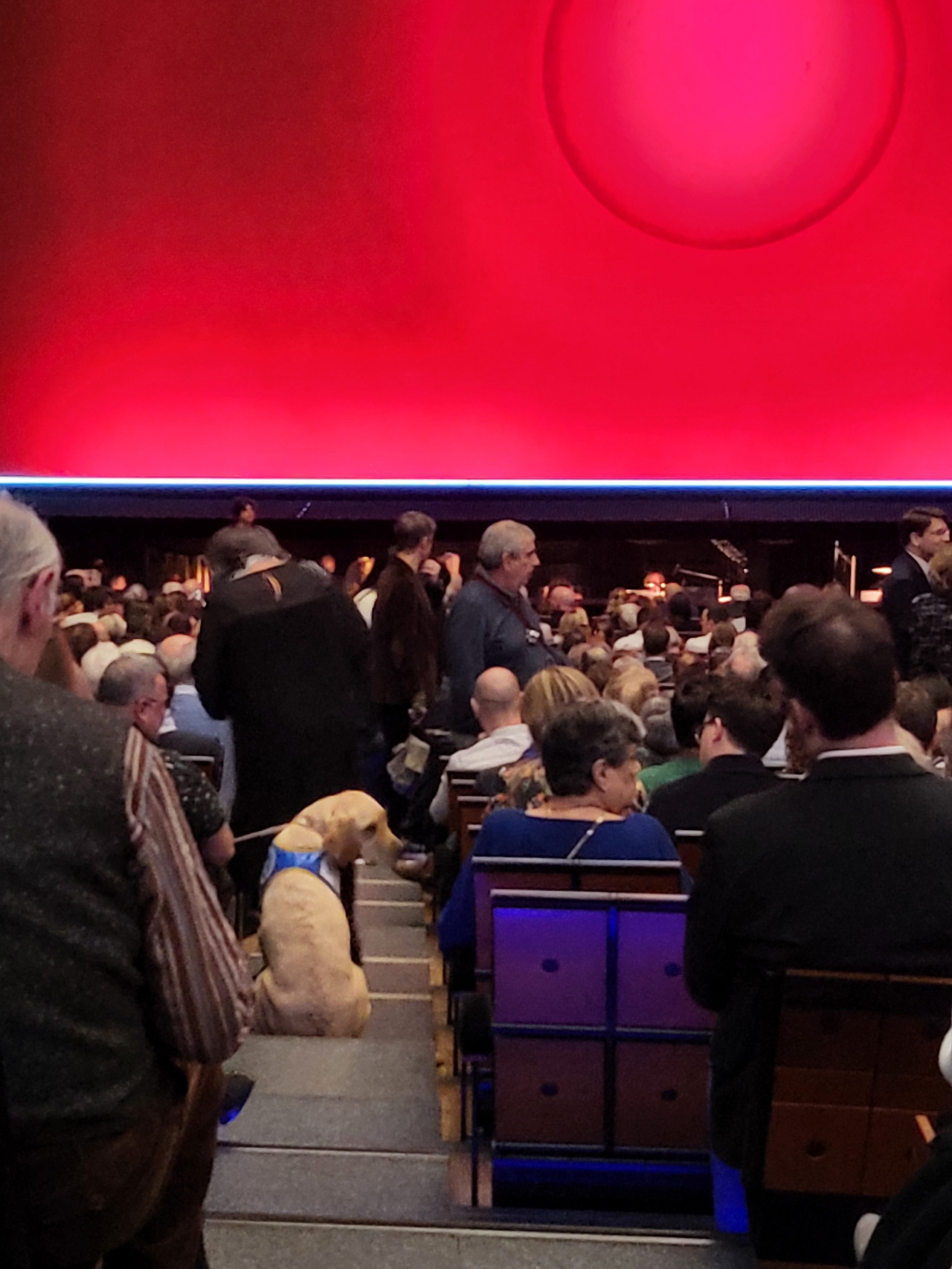그런데 아까 보았던 개, 골든 리트리버가 객석 통로에서 주인과 함께 걸어 나오는 겁니다.