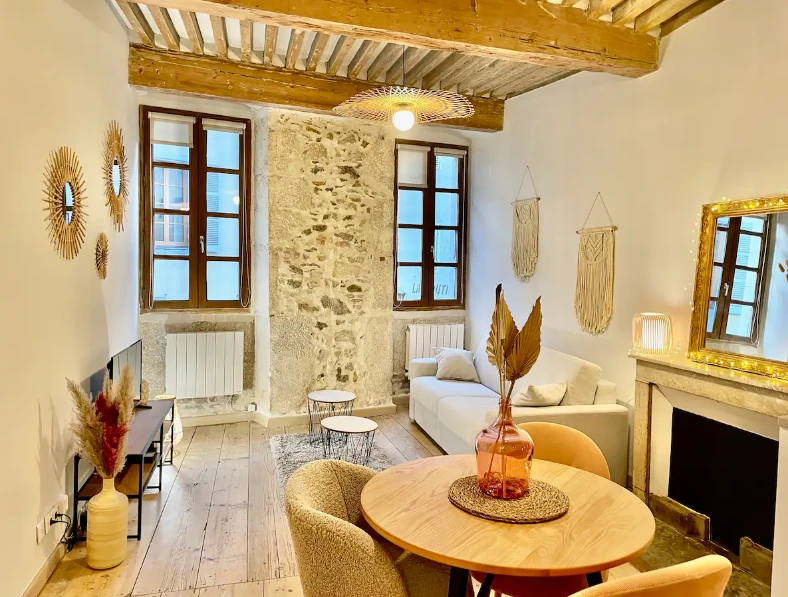 오래된 천장의 서까래와 외벽의 돌은 살려두고 깔끔하고 모던한 가구로 꾸며진 숙소가 맘에 들었지요.