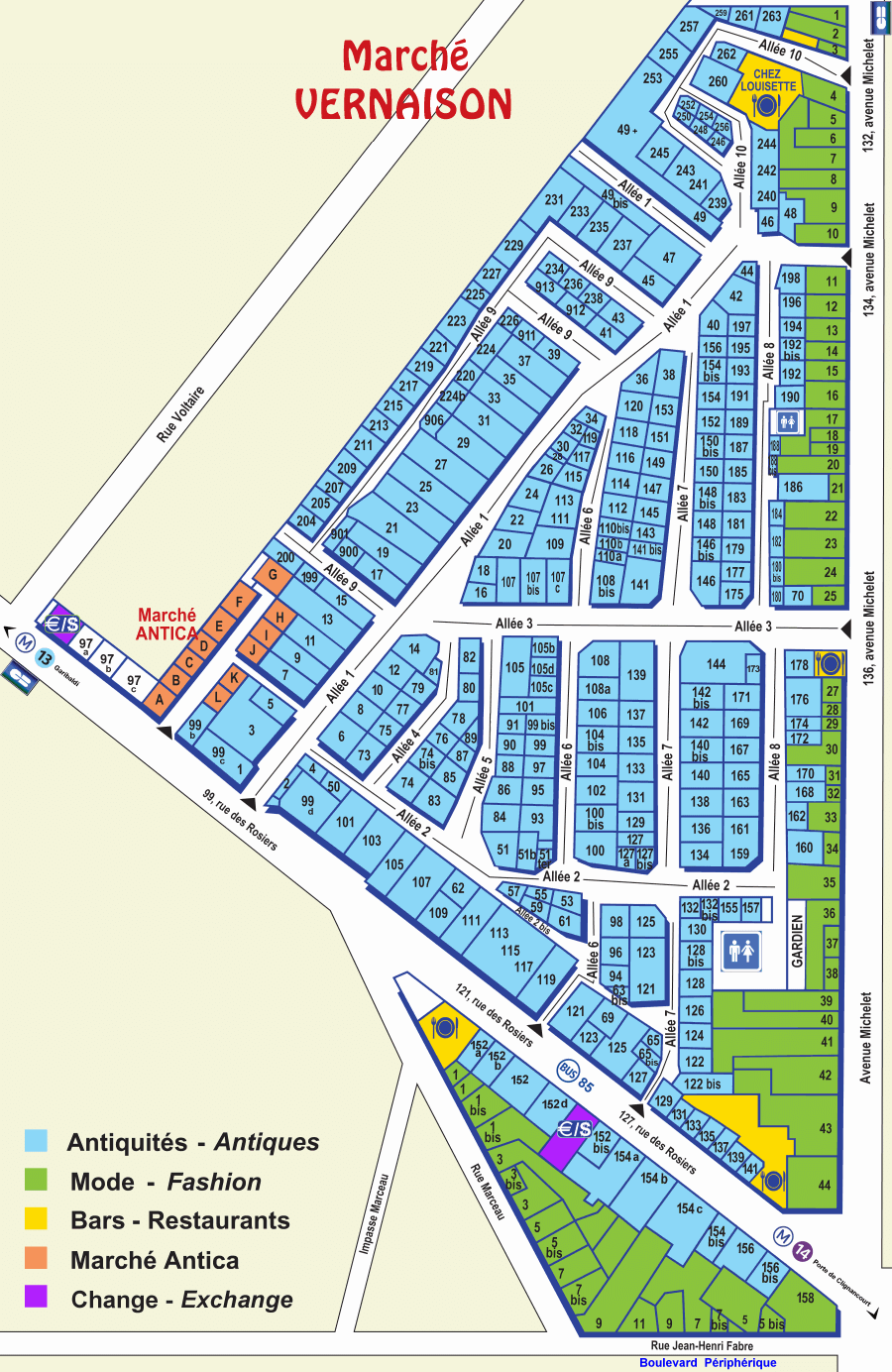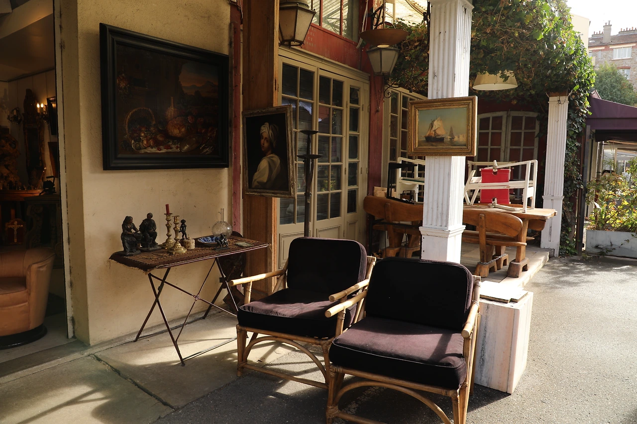 이곳에서는 1950년대 가구를 포함하여 나폴레옹 3세 스타일의 가구, 장난감, 빈티지 카메라 및 가구를 판매하는 말라시스 시장(Marché Malassis)과 고가의 조명, 가구 및 오브제를 판매하는 비롱(Marché Biron) 베르네종 (Marché Vernaison) 등이 있습니다.