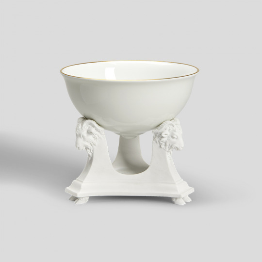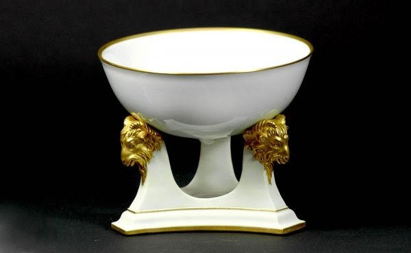 금으로 장식된 도자기 우유 그릇은 숫양 머리로 장식된 비스크 도자기 삼각대 위에 놓여 있는 형태로 그릇 안쪽에 세브르(Sèvres) 표시가 있습니다.