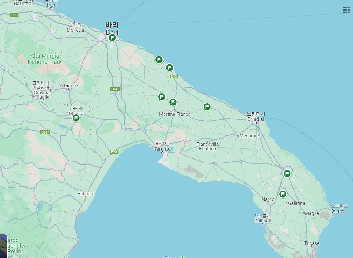 바리를 기점으로 스머프 마을로 유명한 알베로벨로와 레체, 모노폴리, 마테라, 유명한 동굴 레스토랑이 있는 폴리냐노 아 마레, 화이트 시티 오스투니, 로코로톤도 등의 작은 해안 도시를 둘러 보려고 합니다.