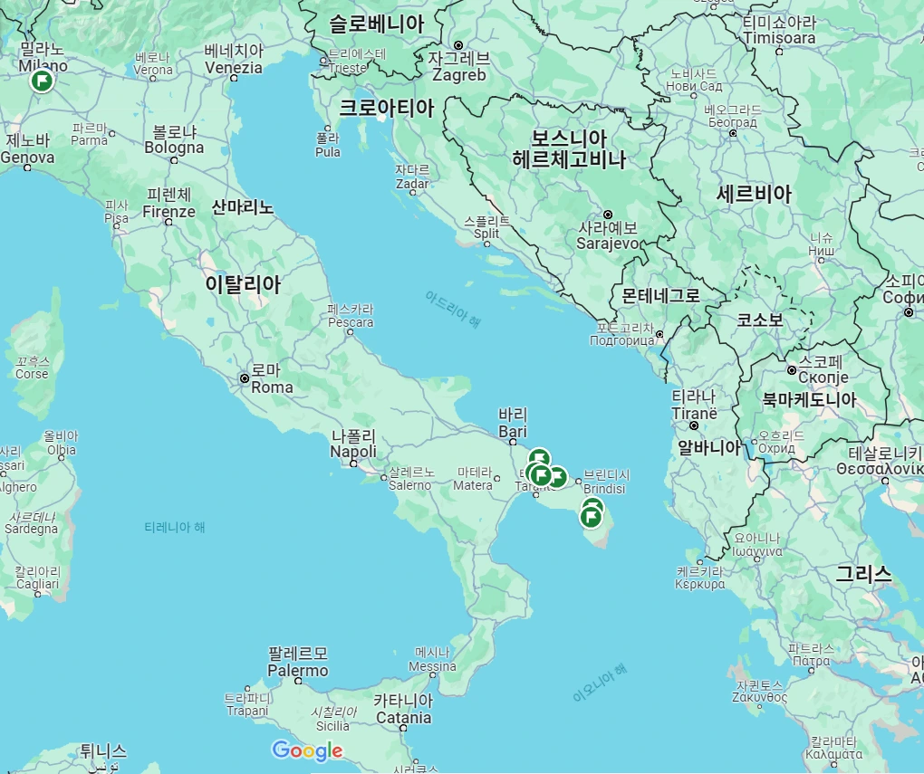동쪽으로 아드리아해, 동남쪽으로 에게해, 남쪽에는 이탈리아의 장화의 뒷굽에 해당하는 살렌토 반도가 있지요.