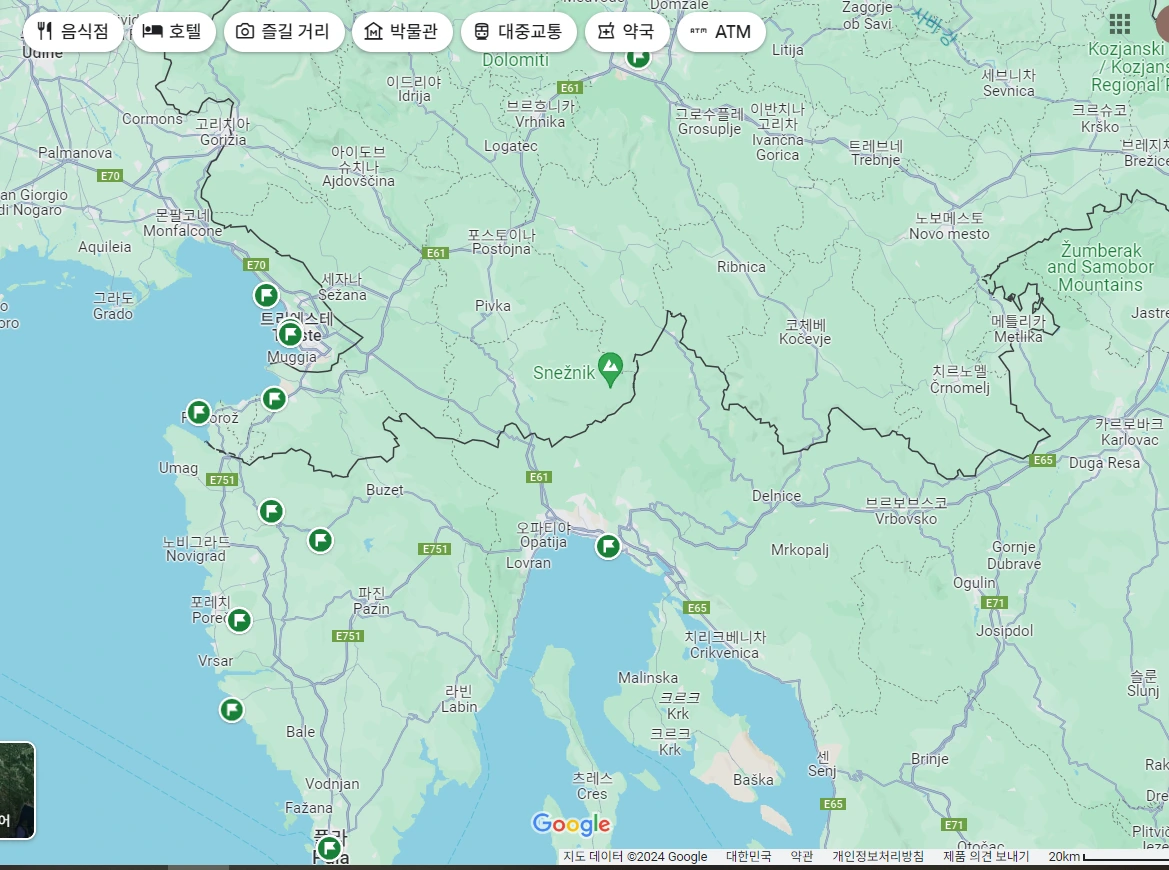 깃발 표시가 있는 곳이 이스트리아 여행 예정 지역