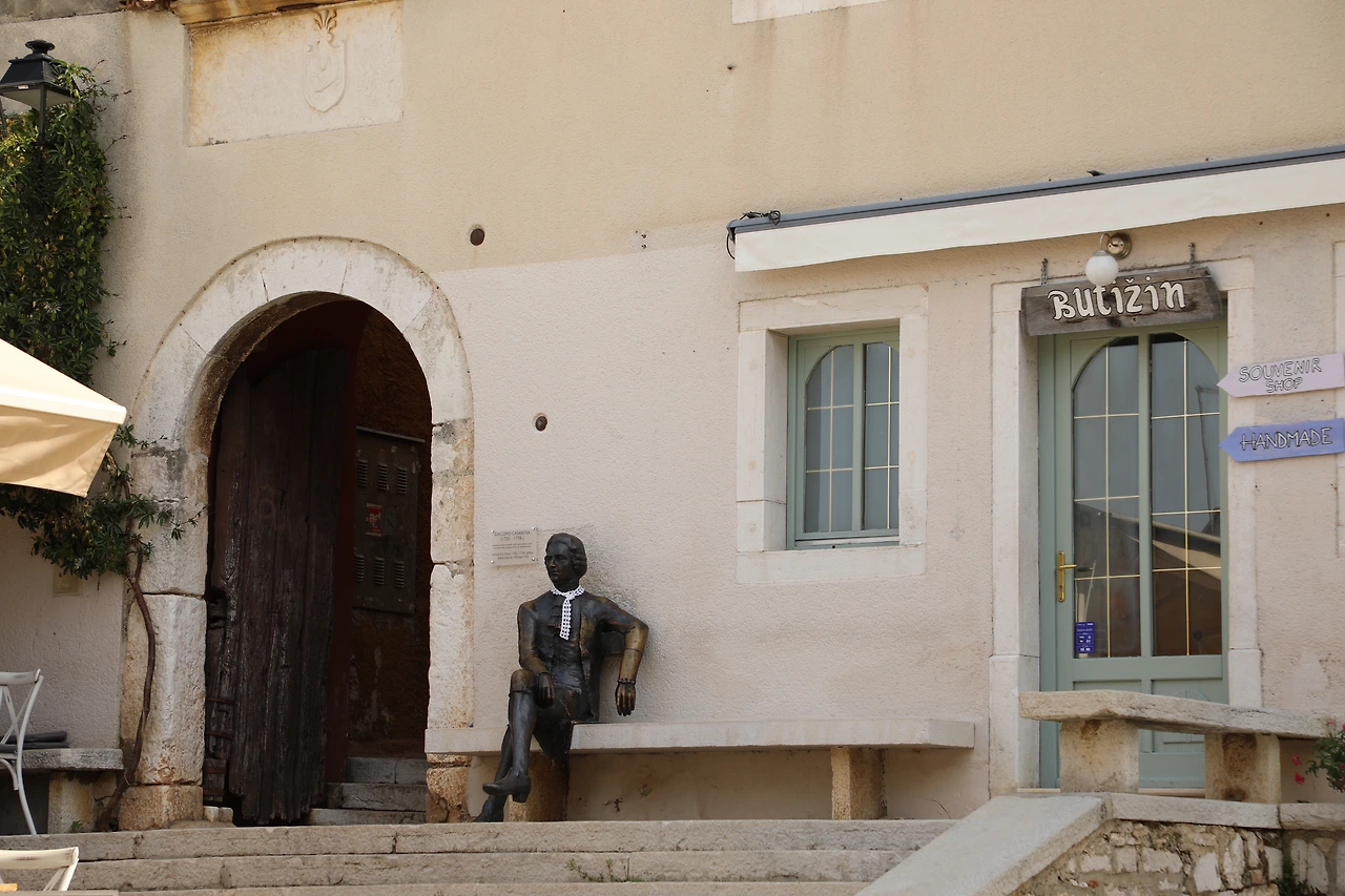 그리고 벽 쪽에는 누군가 앉아있는 모습의 청동 조형물이 있는데 장난스럽게 스카프를 묶어놓았다.