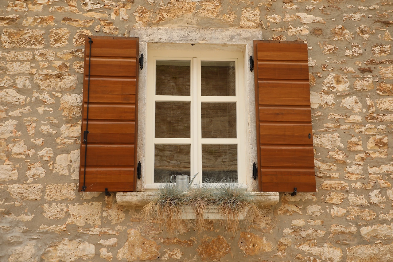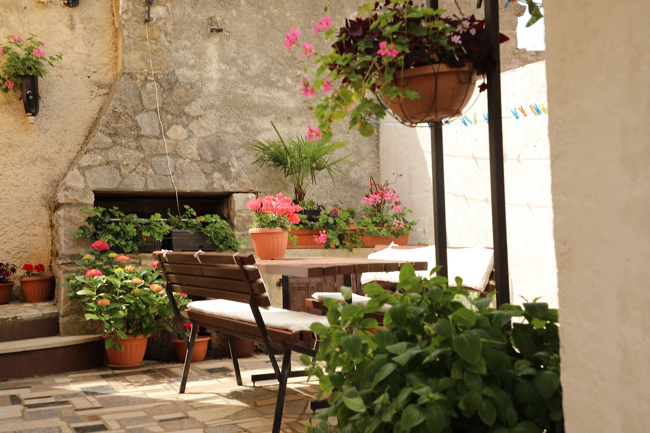 돌을 쌓아 만든 집의 문 밖은 마치 야외 거실처럼 테이블과 의자, 그리고 어김없이 꽃이 있다.