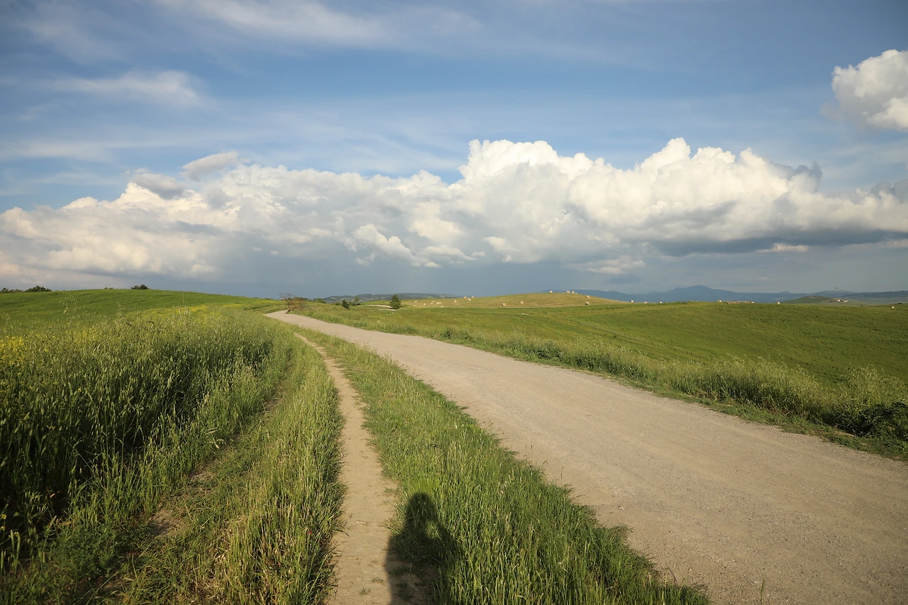 길의 왼쪽으로는 둥글게 말아놓은 커다란 건초더미들이 드문드문 놓여있는 야트막한 언덕이 있고 오른쪽으로는 노란 유채꽃이 하나둘 피어나고 있었다.