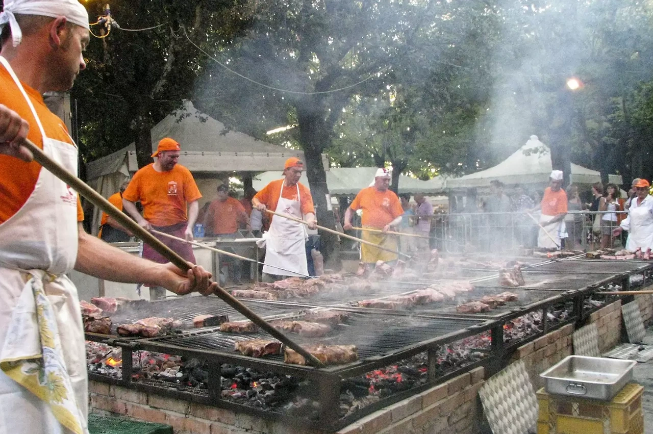 둘레가 무려 14m(이탈리아 최대 규모)에 달하는대형 철재 그릴에 티본(T bone) 스테이크를 구워 먹는데 오후 6시에 시작해서 11시까지 이어진다.