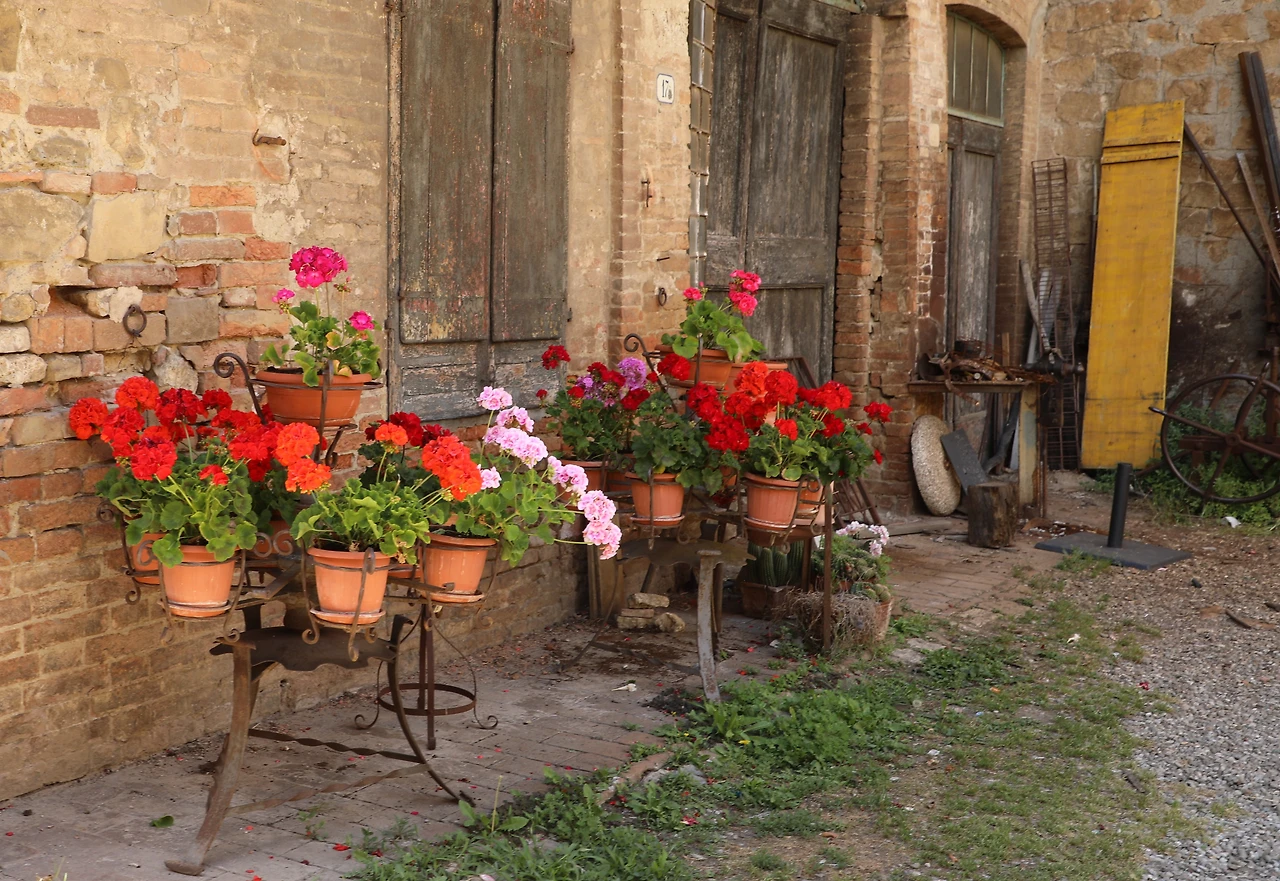 낡은 헛간 앞에는 녹 슨 철재 화분대위에 토분에 담긴 제라늄들이 오손도손 피어있다.