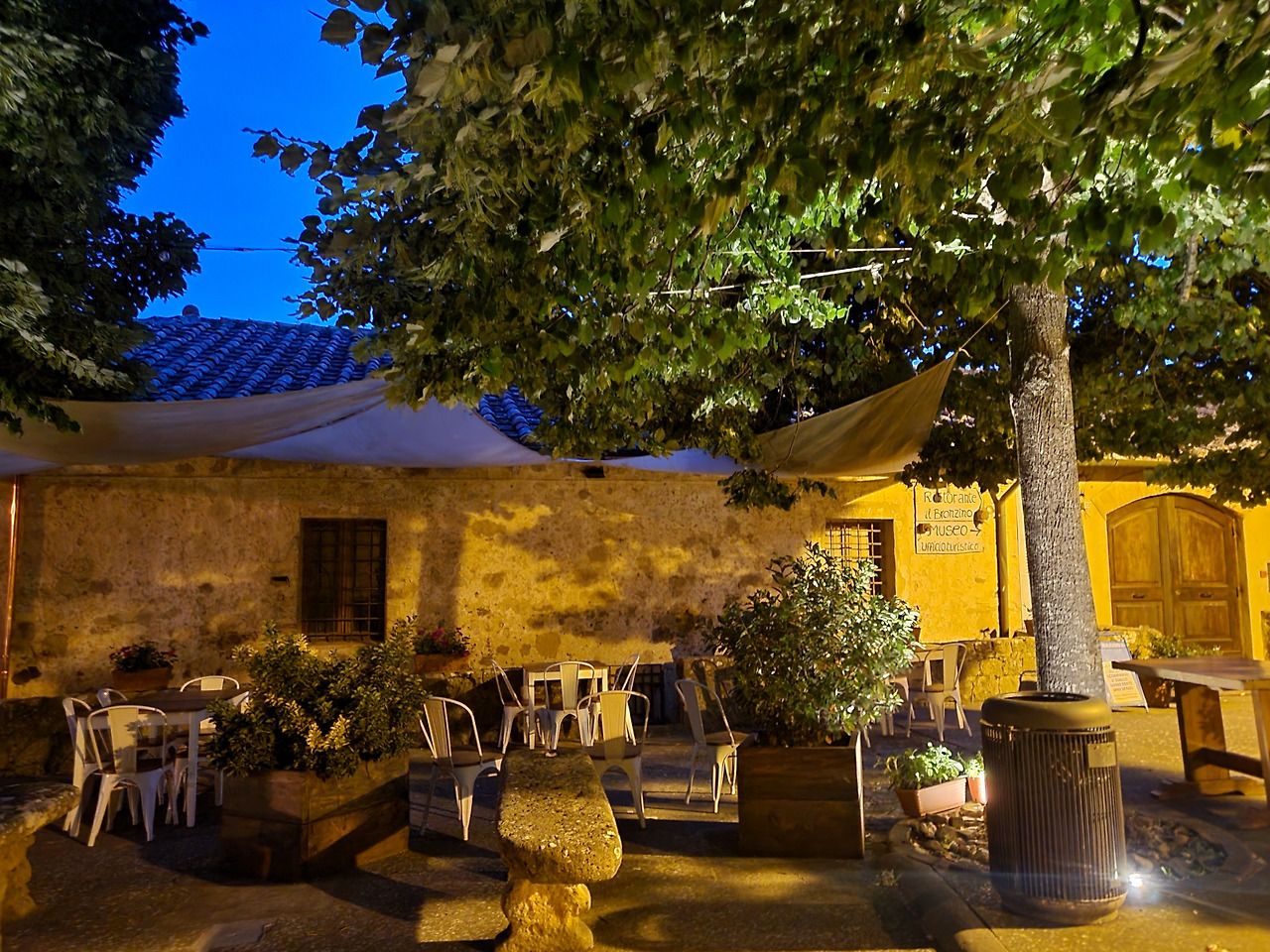 아씨아노의 성문으로 들어가 특이한 열매가 열려있는 커다란 나무 아래 카페의 테이블 앞에 앉았다.