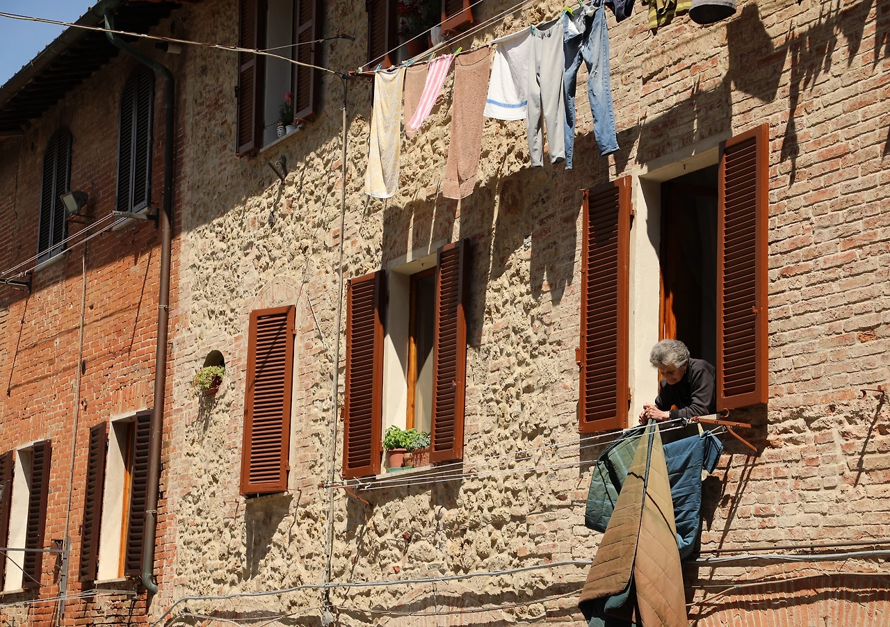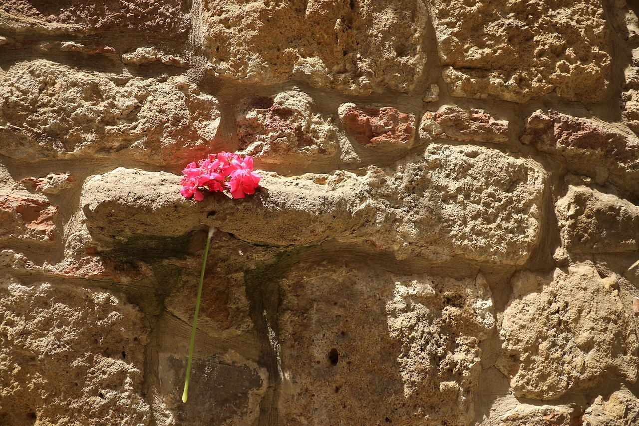 그 옆으로 꽃이 가득한 발코니와 덧문이 내려진 창이 있는 석조 주택들이 모여 있다.