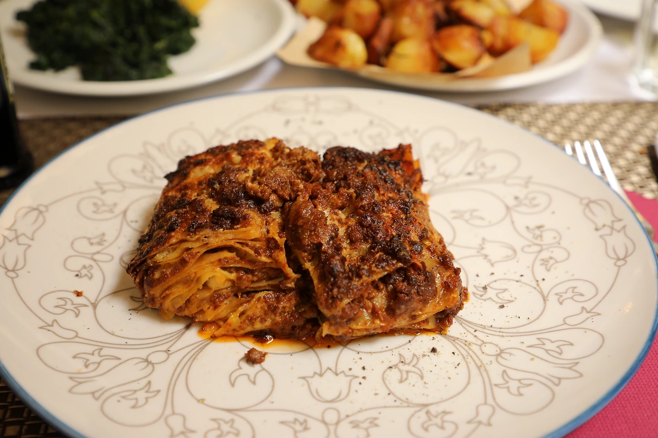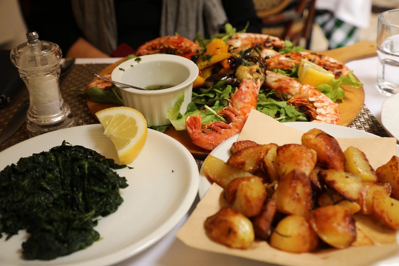 그러므로 왕새우 구이와 라구 소스의 라자냐, 사이드로 구운 감자와 시금치 볶음을 주문했다.